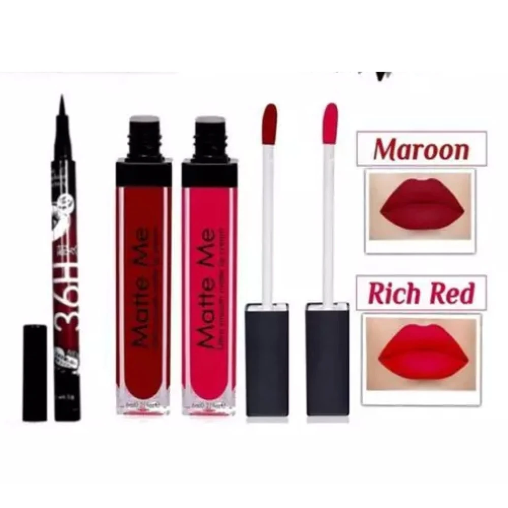 Fancy Cool Product Liquid Matte Me Lipstick set of 2 Red Maroon with waterproof Yanqina 36H Eyeliner Black