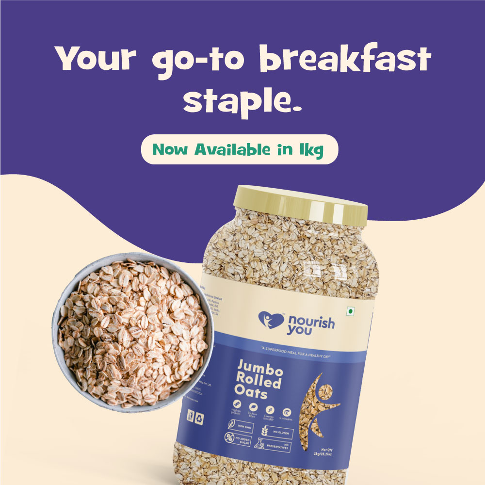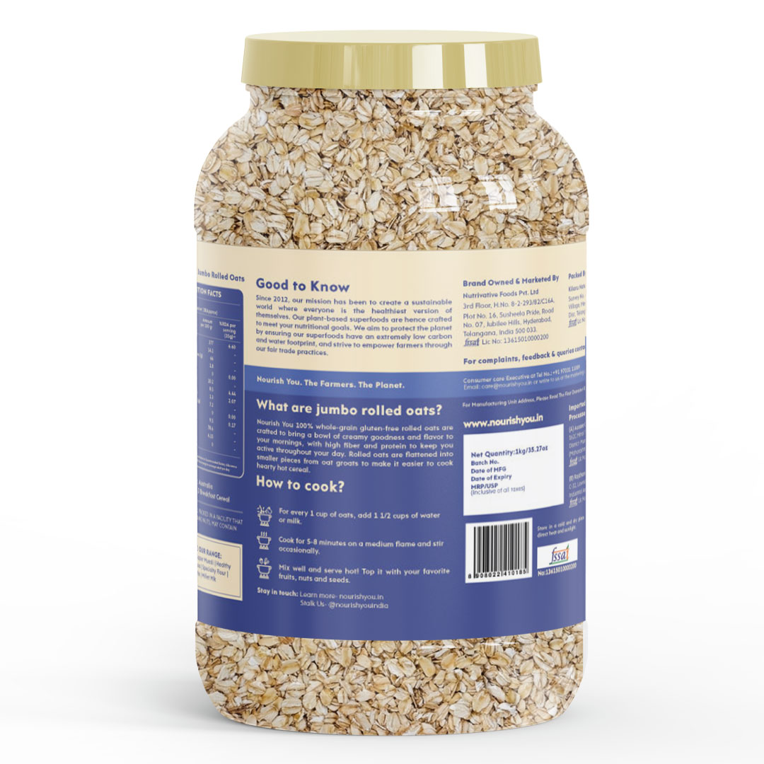nourish you Jumbo Rolled Oats are 100% wholegrain, gluten-free, and rich in fiber and protein. They support heart health, digestion, and provide sustained energy. Perfect for creamy oatmeal, smoothies, or baking.