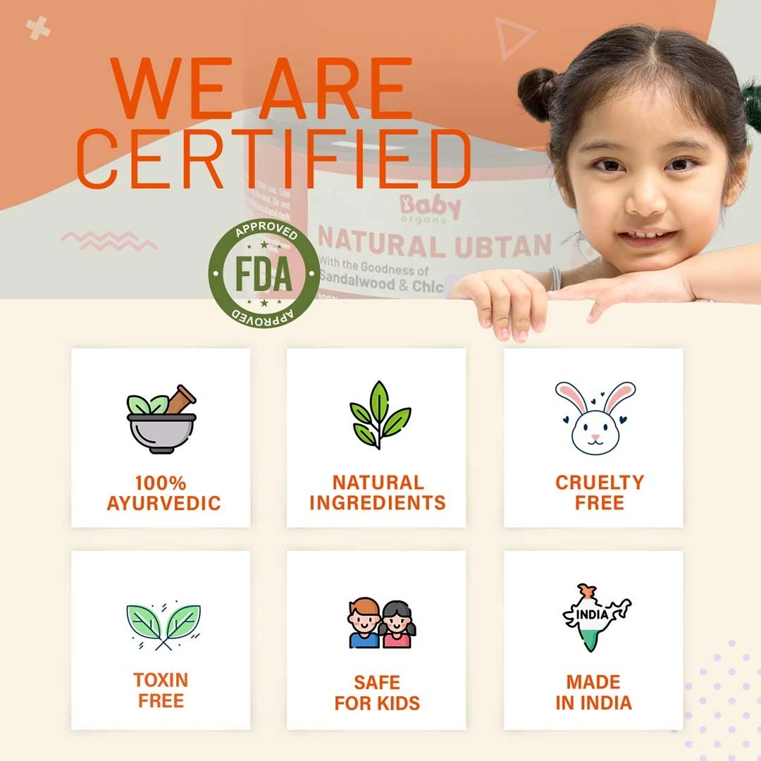BabyOrgano Natural Ubtan, a gentle and wholesome skincare product designed specifically for your little ones. Unlock the secrets of gentle skincare with our Natural Ubtan, designed to pamper and nourish your child's skin naturally. BabyOrgano Natural Ubtan is suitable for newborns and all skin types. It is free of chemicals and is FDCA approved.