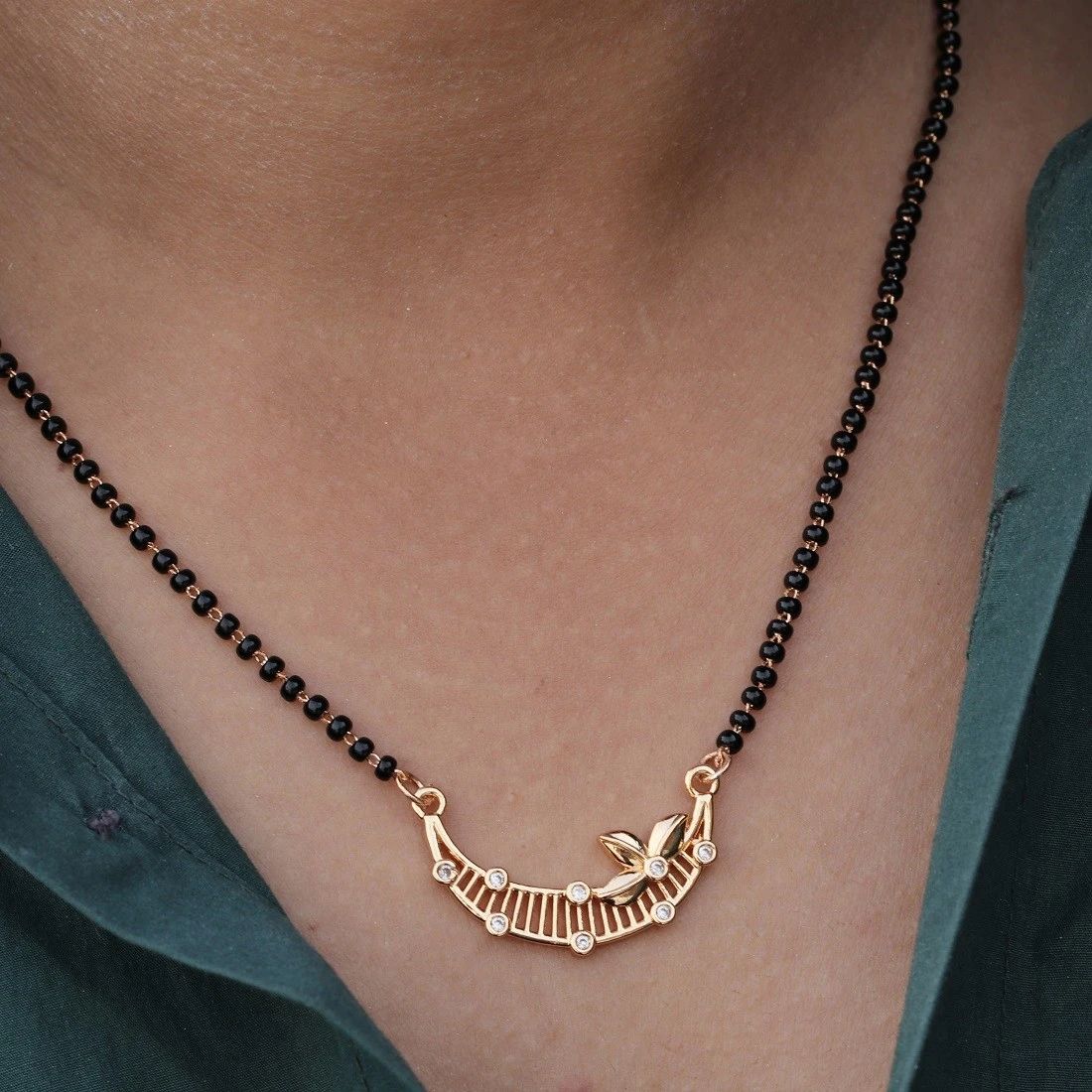 A rose gold mangalsutra is a beautiful and elegant piece of jewelry that combines the cultural significance of a mangalsutra with the modern aesthetic of rose gold.