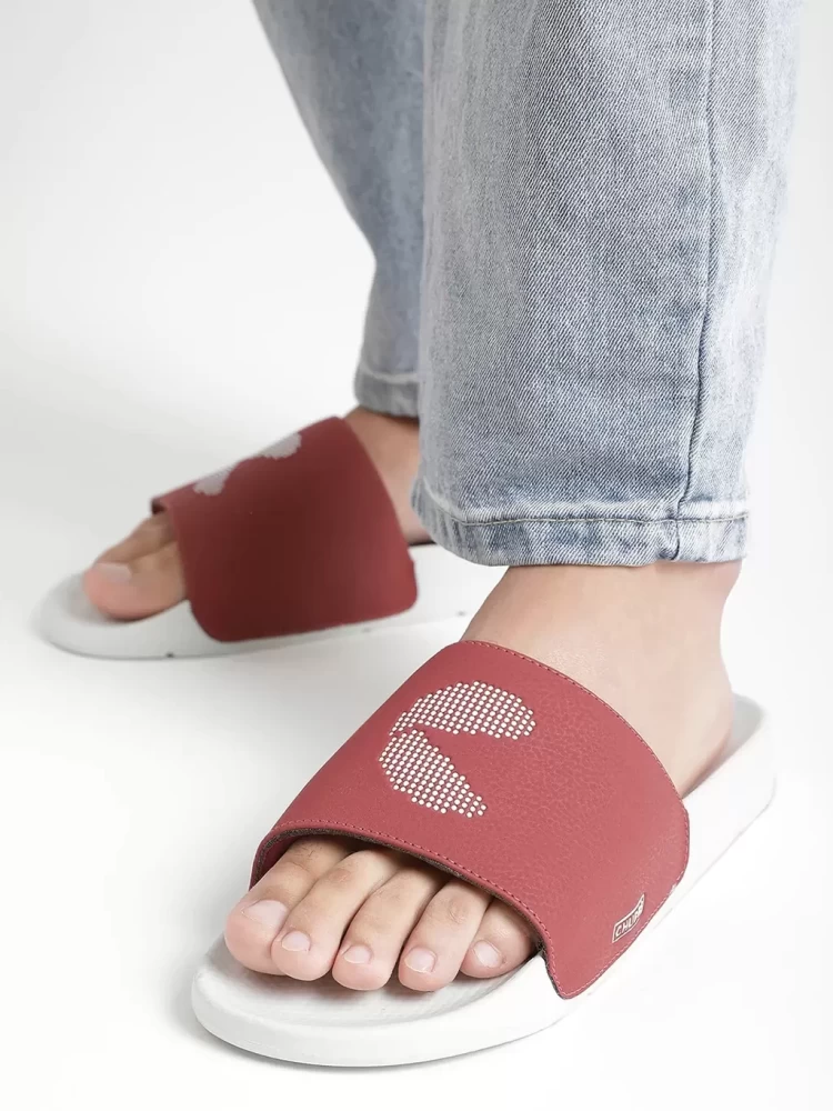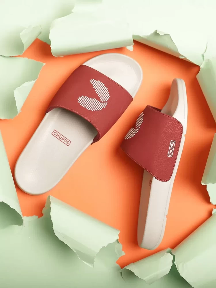 - These red men's sliders with a white sole and our iconic logo on the upper are a must-have addition to your footwear collection. Click on the buy now link below and become a proud owner of these sliders.