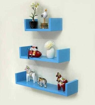 CraftOnline Wooden Handcrafted Wall Shelf Beautiful Floating Wall Racks Shelves Living & Bed Room Decor U Shaped Set of 3 (Blue)
