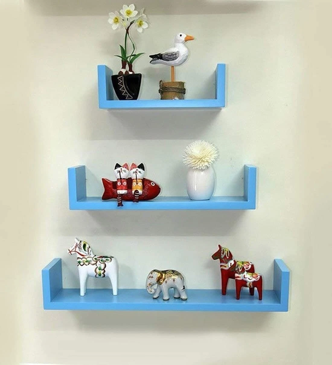 CraftOnline Wooden Handcrafted Wall Shelf Beautiful Floating Wall Racks Shelves Living and Bed Room Decor U Shaped Set of 3 (Blue)