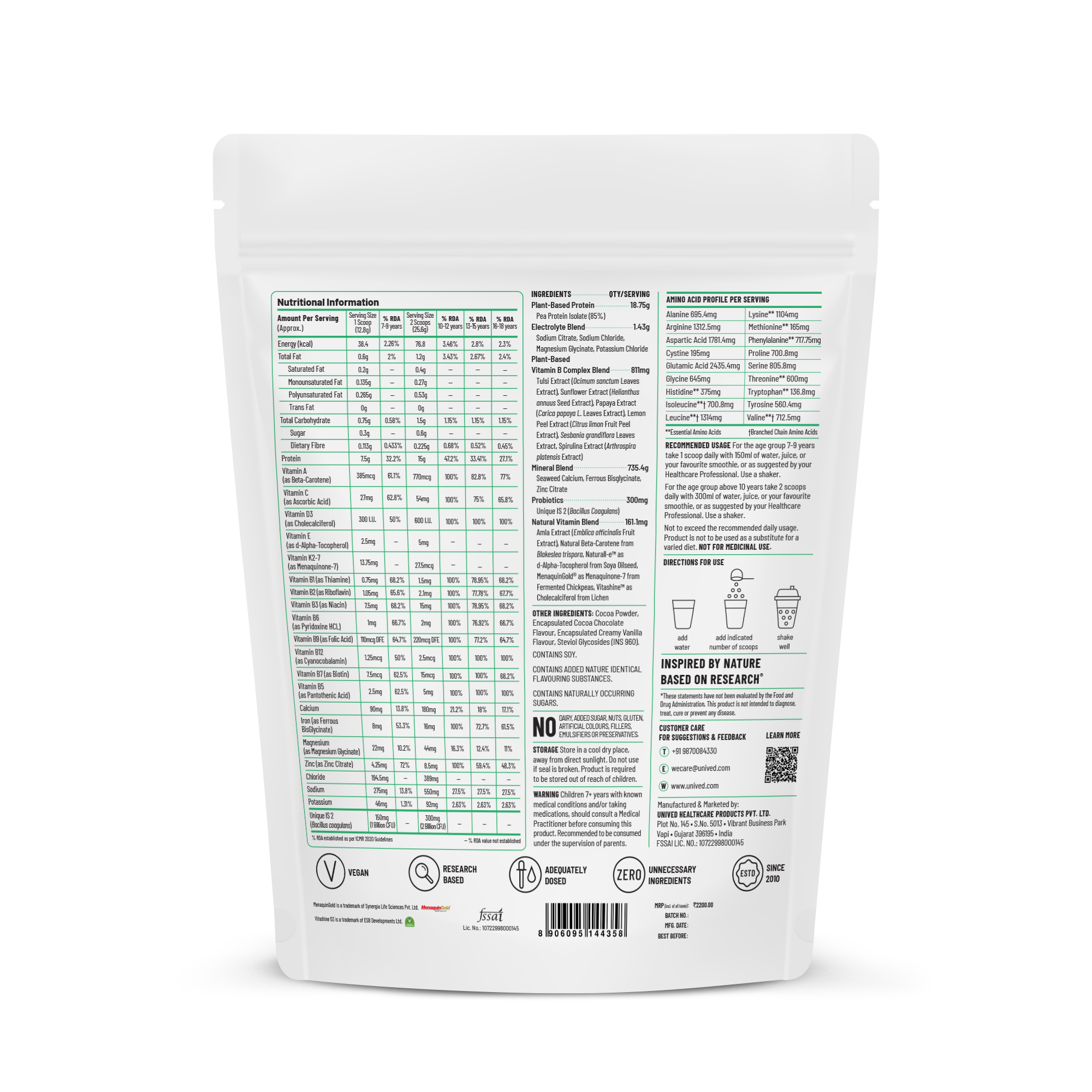 Unived Juniors Daily Nutrition 30 servings is made specially for growing kids and teens It provides 15g of high quality plant protein along with essential vitamins minerals electrolytes and probiotics to support healthy growth and strong immunity This tasty chocolate drink is sugar free easy to digest and keeps kids energetic With 30 servings in each pack it helps support muscle growth hydration and overall wellness in an everyday simple way