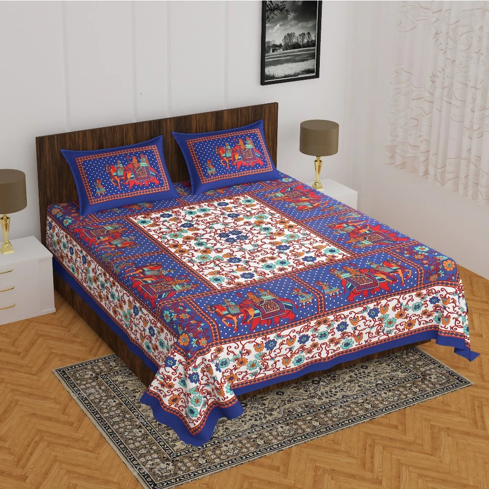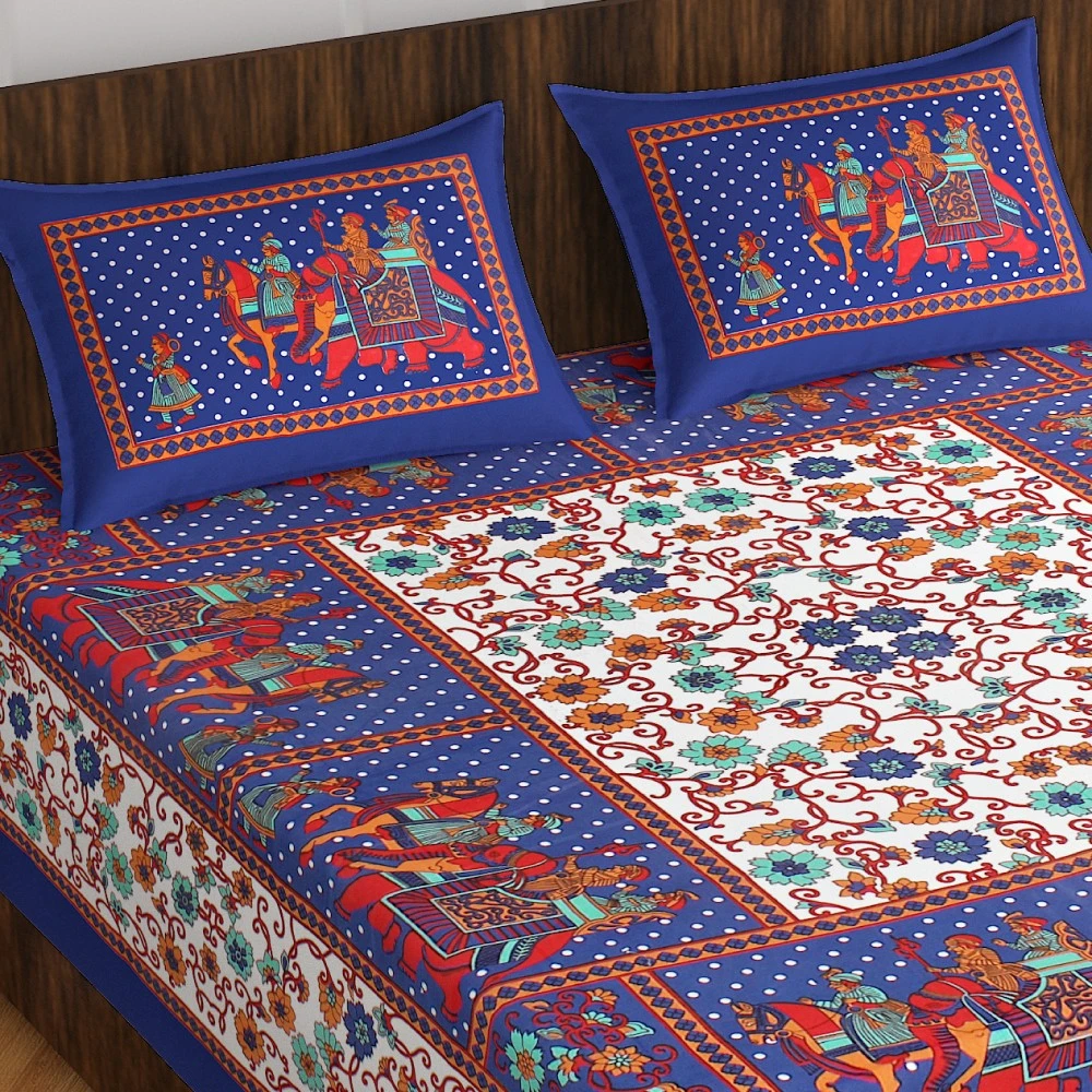 Jaipuri Sanganeri Floral Navy Blue Printed Double Bedsheet with 2 Pillow Cover