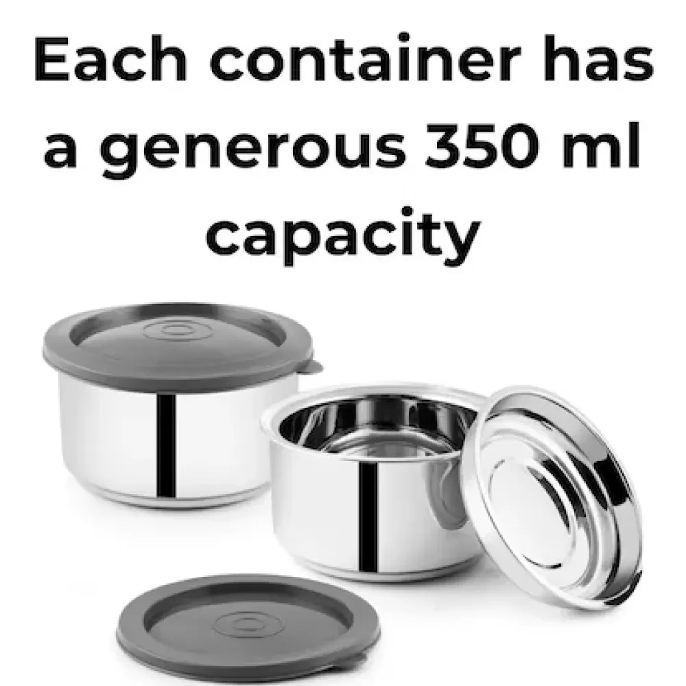 Introducing the Uninox Stainless Steel Air Tight Container Set, a reliable solution for storing your meals securely. This set includes two sleek containers, each with a capacity of 350 ml, providing ample space to store your favorite dishes or snacks.