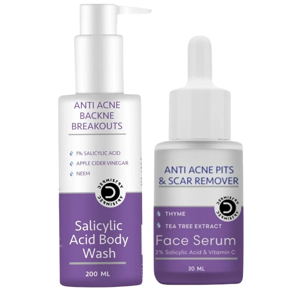 Dermistry 1% Salicylic Acid Back Acne Body Shower Gel Wash and 2% Salicylic Acid Anti Acne Face Serum Pack of 2 230 ML