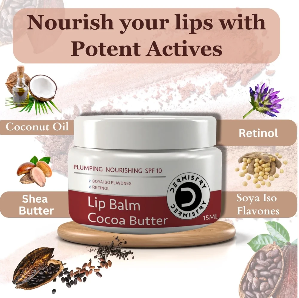 Dermistry Plumping Nourishing SPF-10 Lip Balm is a perfect blend of nourishing ingredients such as Shea Butter, Soya Iso Flavones, and Coconut Oil. Shea Butter & Retinol heals dry and chapped lips. Coconut oil's moisturizing, emollient properties make it potentially useful for soothing dry, chapped lips.