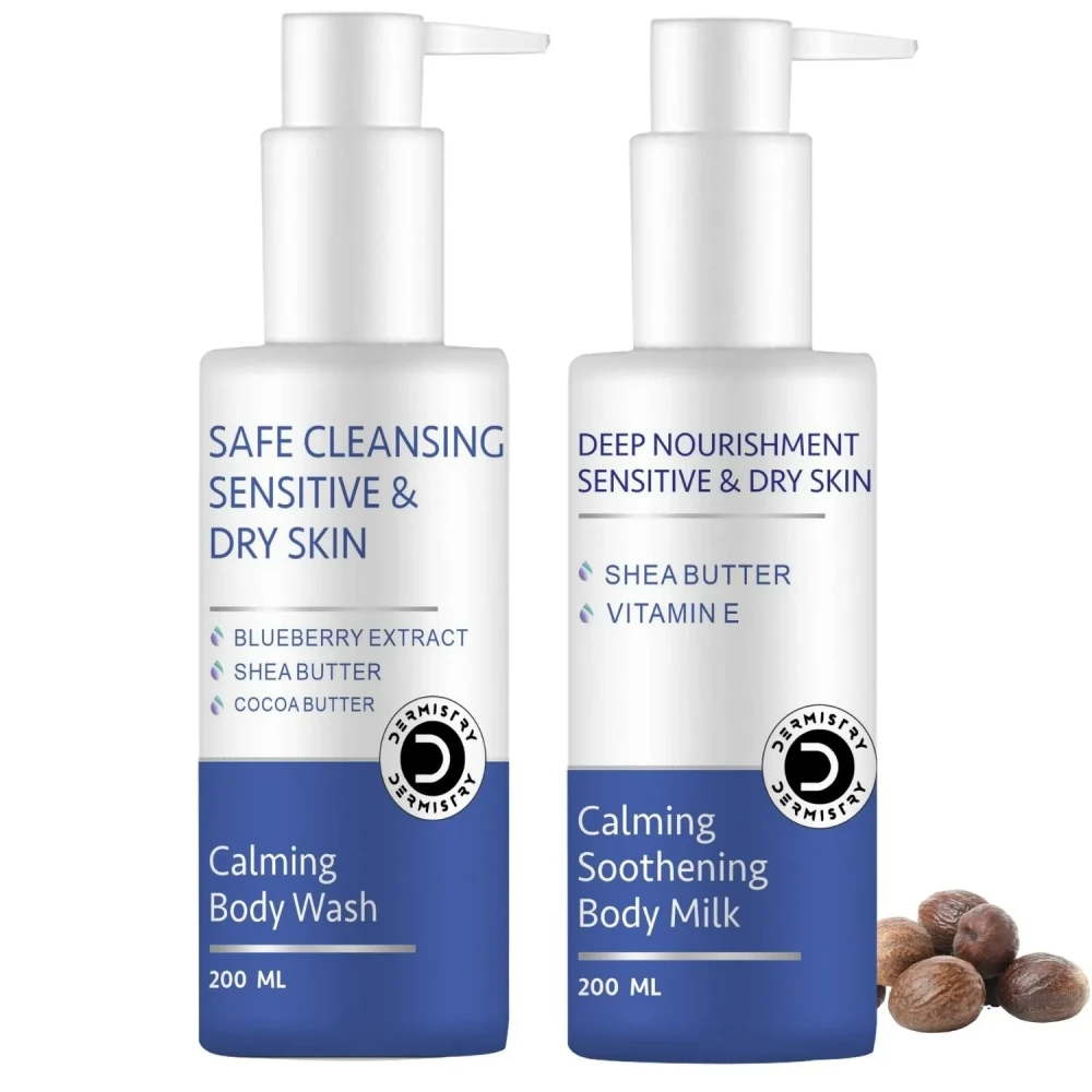 Dermistry Sensitive and Dry Skin Calming Sooathing Thick Creamy Body Wash and Calming Soothing Body Milk Lotion Pack of 2 400 ML