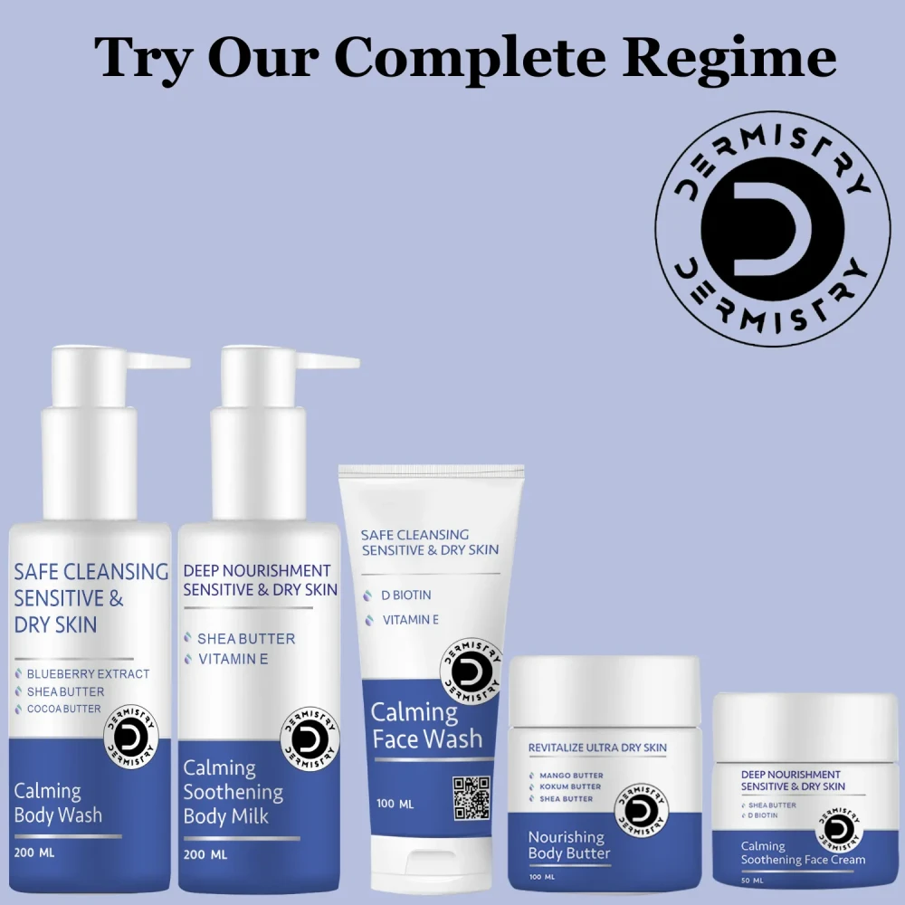 Dermistry Calming Body Wash Soothe as you cleanse with this gentle, soap-free shower gel specially formulated to respect your skin's natural moisture barrier and pH. This gentle formula won't strip your skin of moisture. Enriched with Shea Butter, Cocoa Butter and blue Berry Ext is specially formulated for sensitive, dry skin.