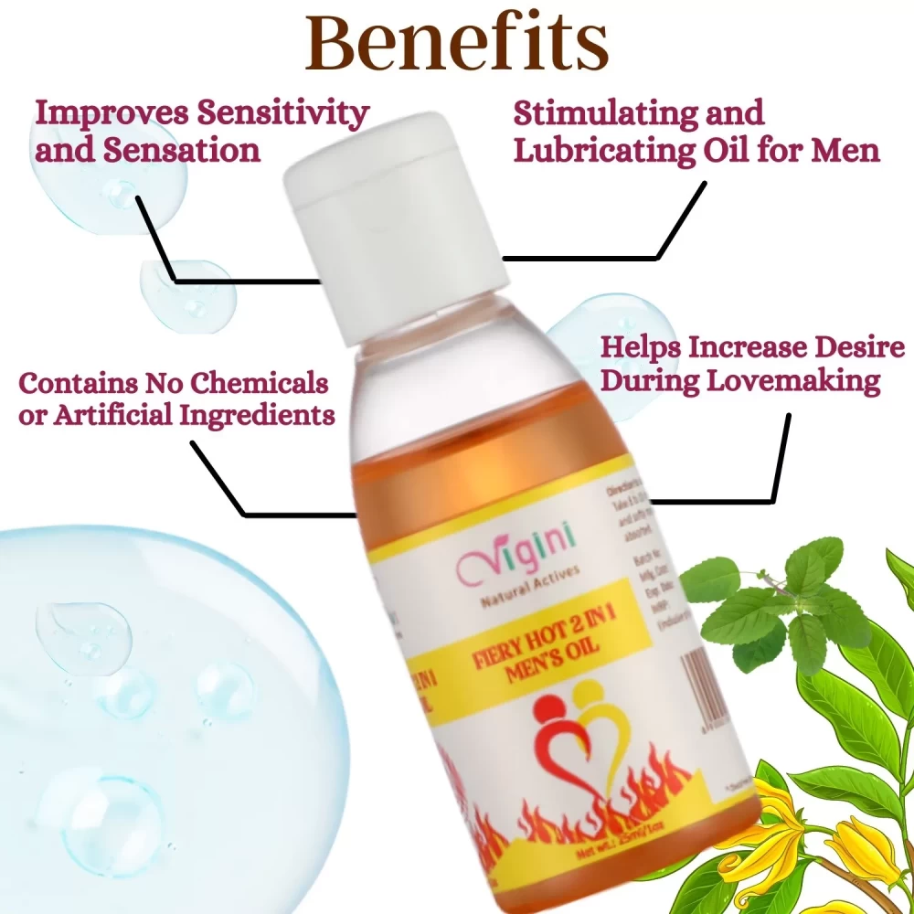 Vigini Natural Actives Fiery Hot 2 in 1 Men's Oil restores blood flow and stimulates the production of testosterone which increase libido. This nourishes and increases levels of nitric oxide from the nerve endings of muscles increasing stamina and libido. So, not only does the oil improve sexual health and strength, but also increase the blood flow into the organ. It helps in enhancement and increases energy and stamina and improves overall satisfaction.