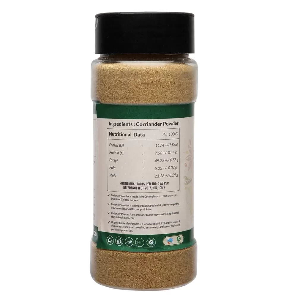 Organic Coriander Powder is a wonder spice full of anti-oxidants & demonstrates immune boosting, antianxiety, anticancer and neuro protective properties.