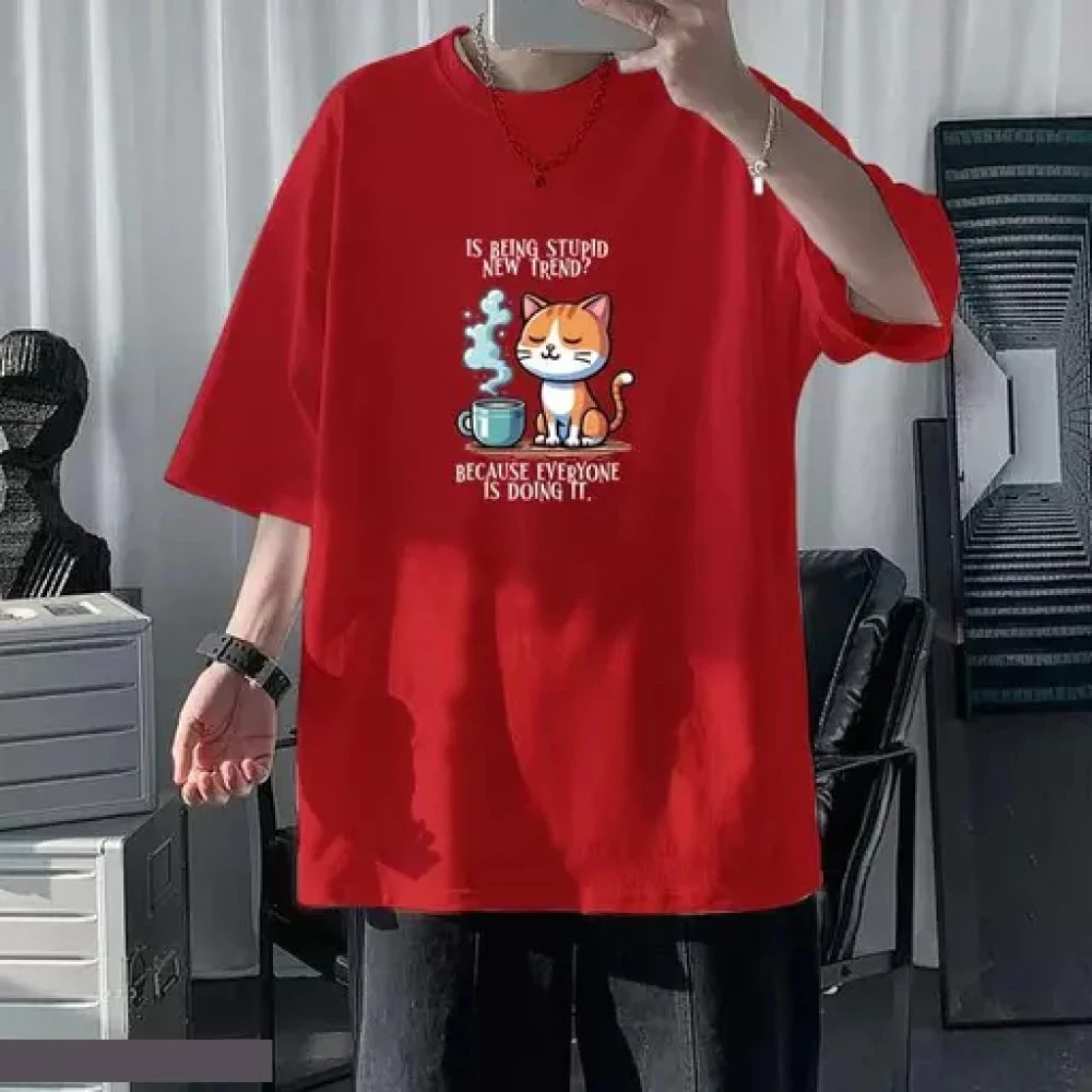 Men Red oversize Stupid Society Cat T Shirt is a cotton t-shirt that is cool and quirky. It has three-quarter sleeves and a printed pattern that features a cat wearing sunglasses and the words "stupid society". The t-shirt has an oversize fit that makes it comfortable and trendy, and comes in a range of colors. Whether you want to express your attitude, or just love cats, this t-shirt is the perfect choice for you.