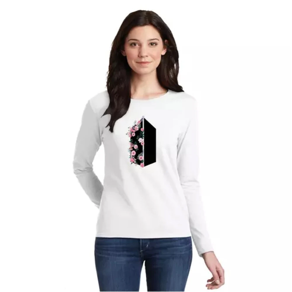 This T shirt is made of soft and breathable cotton fabric that keeps you cozy and cool. The full sleeves and the round neck give you a chic and elegant look. The printed pattern features the BTS logo and the word "ARMY" in black, creating a striking contrast with the white background. This T shirt is perfect for any occasion, whether you want to attend a BTS concert, watch their videos, or just express your fandom. You can pair it with jeans, leggings, or skirts for a versatile and fashionable look. This T shirt is a must-have for any BTS fan or ARMY member who wants to show their loyalty and admiration.