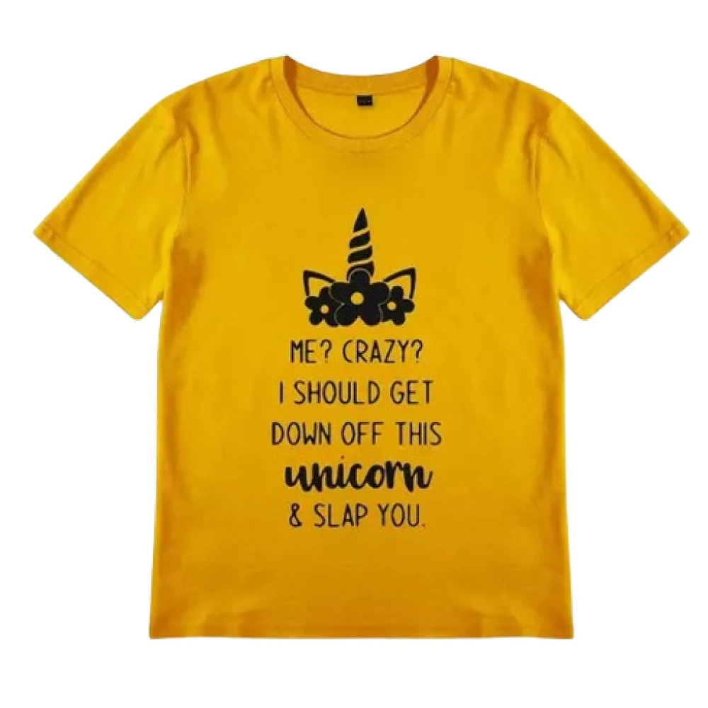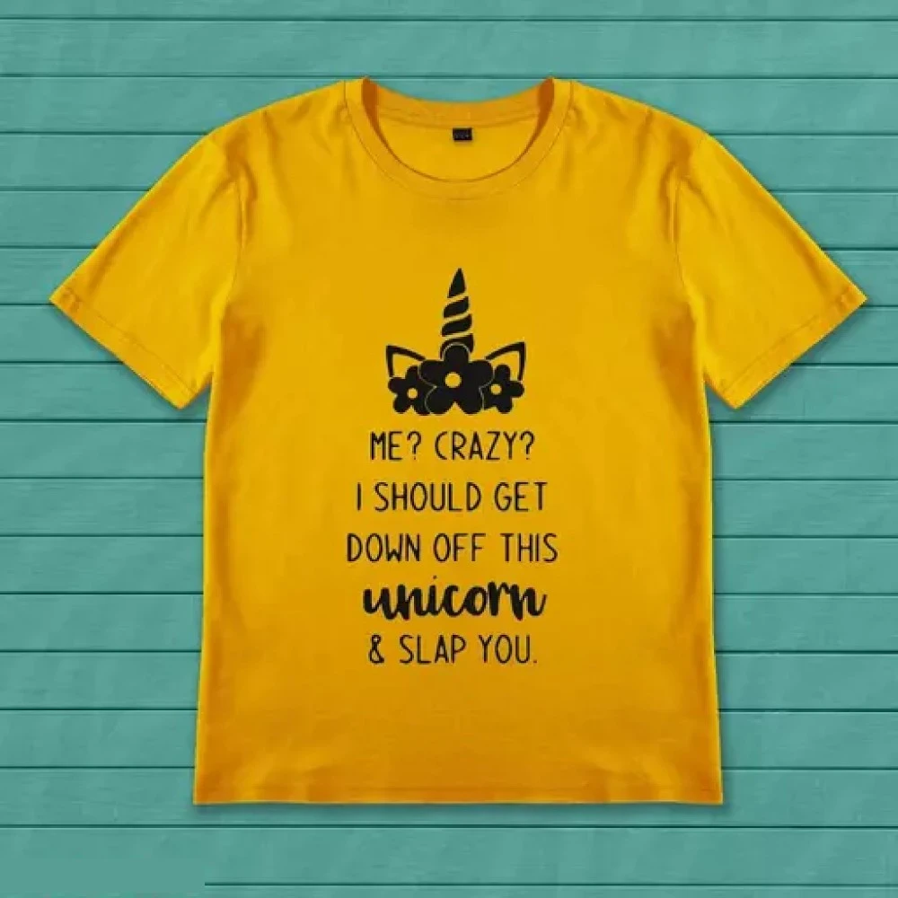 Add some magic and sparkle to your style with this women unicorn printed t-shirt. This t-shirt is made of cotton fabric that is soft, breathable, and comfortable. The solid color background contrasts with the colorful unicorn print on the front, adding a touch of whimsy and fun. The short sleeves and the round neck offer a casual and relaxed look, while the regular fit and the straight hem provide a flattering and comfortable feel. Whether you wear it with jeans, leggings, or skirts, this t-shirt is a perfect choice for any unicorn lover.