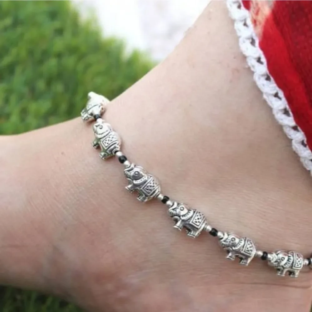 Add a touch of traditional charm to your jewelry collection with the Antique Elephants Silver Payal Anklet for Women. Crafted from durable brass and plated with oxidised silver, this anklet features a unique design adorned with antique elephants, symbolizing strength and grace.