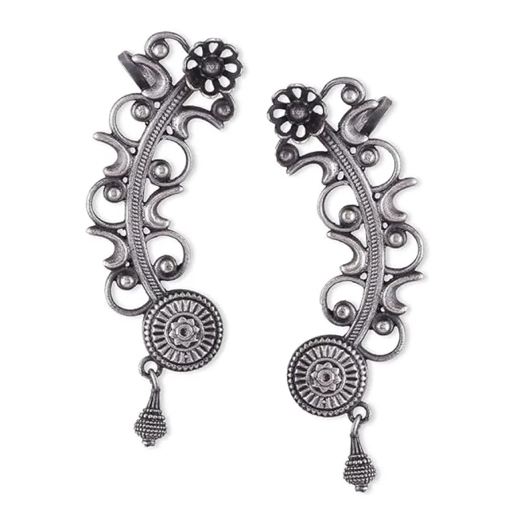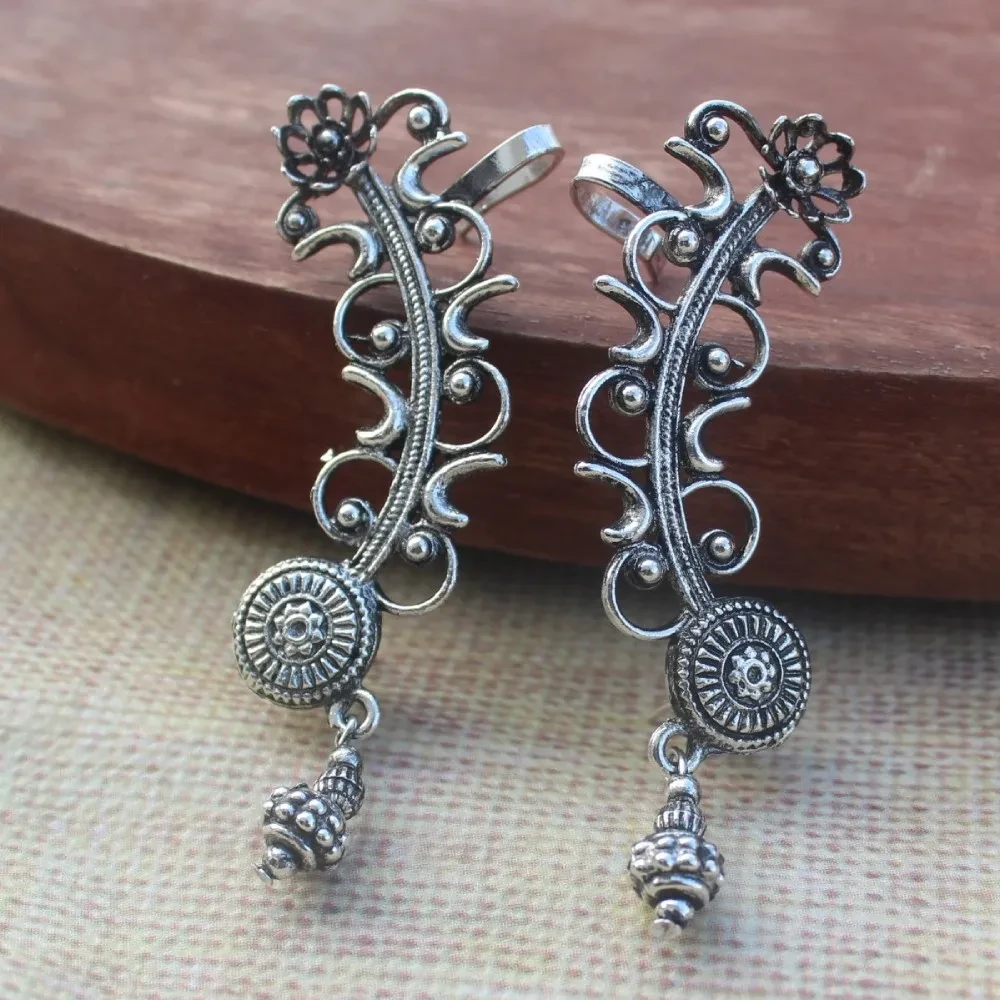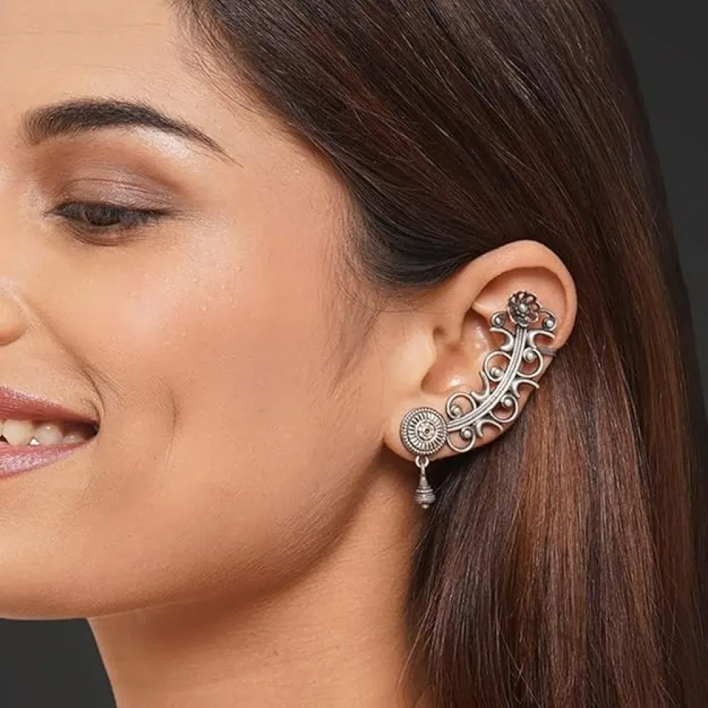 Elevate your accessory collection with the Antique Silver Floral Earcuff for Women. This bohemian-inspired piece is crafted from high-quality brass and boasts an antique silver finish that highlights its intricate floral design. The ear cuff style provides a comfortable fit without the need for piercing, making it an easy and stylish addition to any look.
