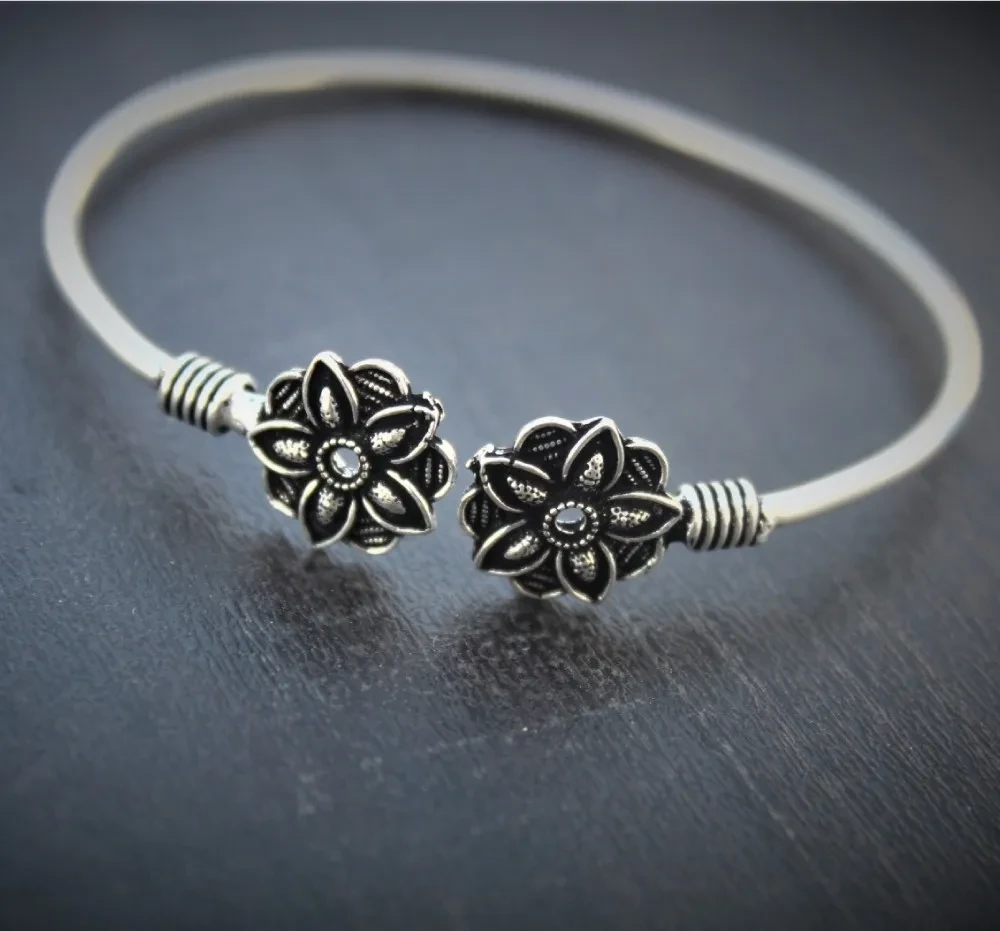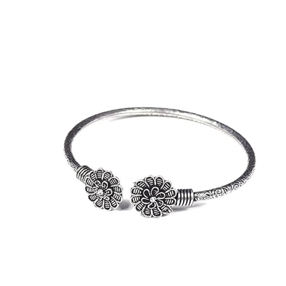 Enhance your jewelry collection with the exquisite Flower Style Adjustable Bangle Bracelet. Crafted from high-quality brass and plated with oxidised silver, this bracelet features a beautiful floral design that exudes elegance and charm. Weighing 250 grams, it offers a substantial yet comfortable fit, perfect for adding a touch of sophistication to any outfit.