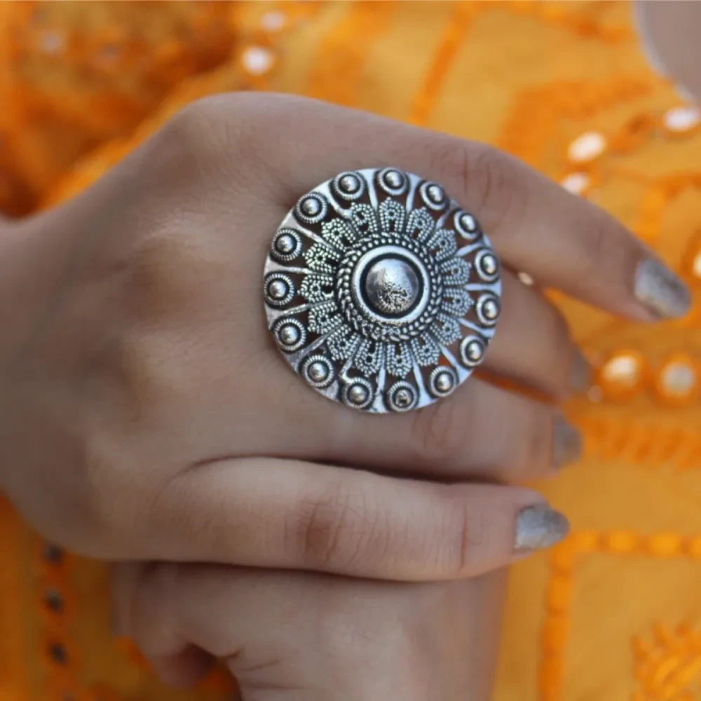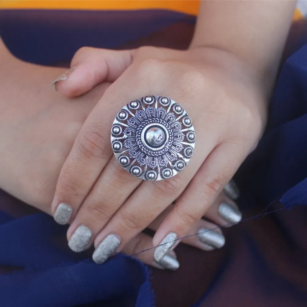 Enhance your accessory collection with the Oxidised Artificial Stone Brass Ring. Crafted from high-quality brass, this finger ring features an elegant oxidised silver finish, highlighting the intricate design and embedded artificial stone.  it offers a comfortable yet striking presence on your finger. Perfect for any occasion, whether you're dressing up for a special event or adding a touch of sophistication to your everyday look, this ring is a versatile and stylish addition to your jewelry ensemble.