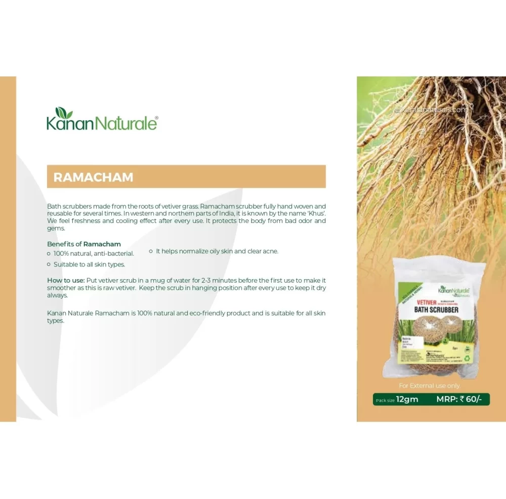 Bath scrubbers made from the roots of vetiver grass. Ramacham scrubber fully hand woven and reusable for several times .100% natural ,anti bacterial and it helps normalize oily skin and clear acne. For External use only.