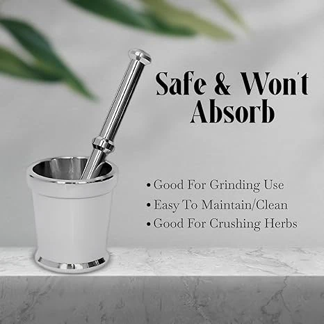 Round knob on top of pestle for comfortable grip and full control. Perfectly balance and it can even stand on its own. Bowl shaped to allow even grinding and keep ingredients in. Great for crushing, grinding and mixing herbs and spices.