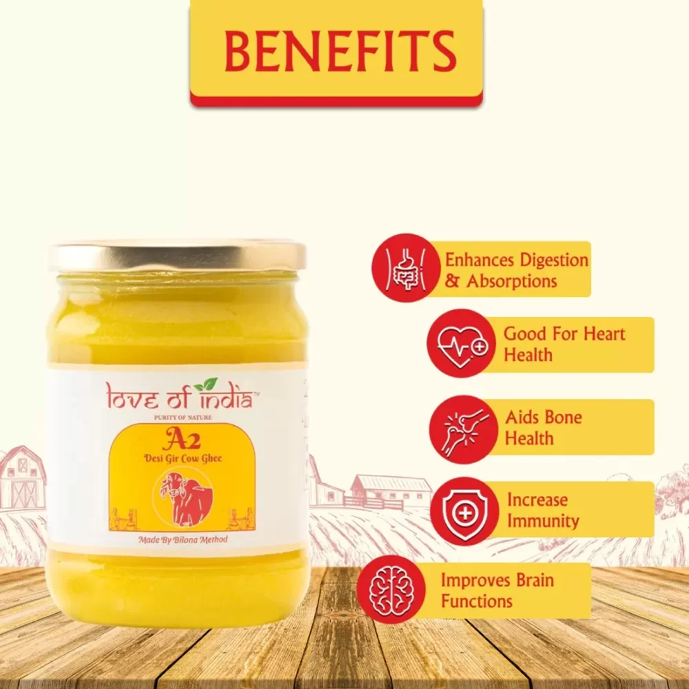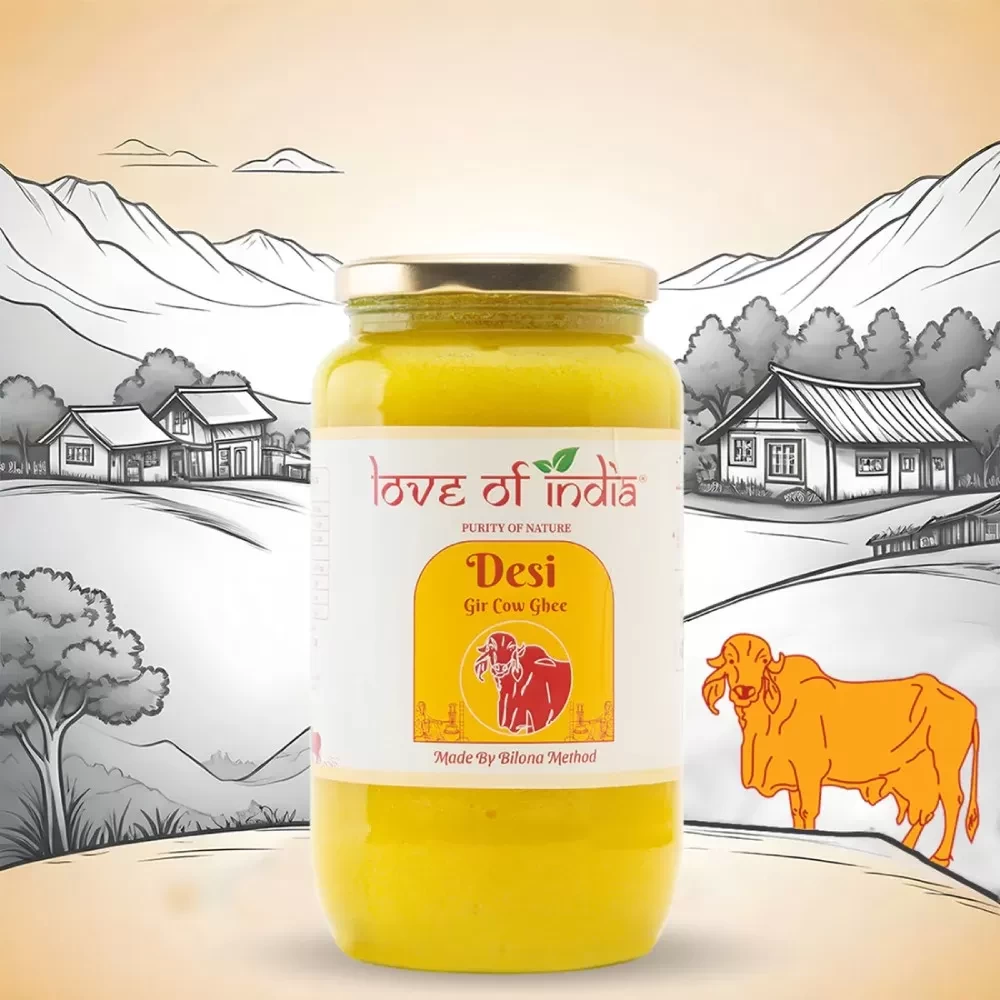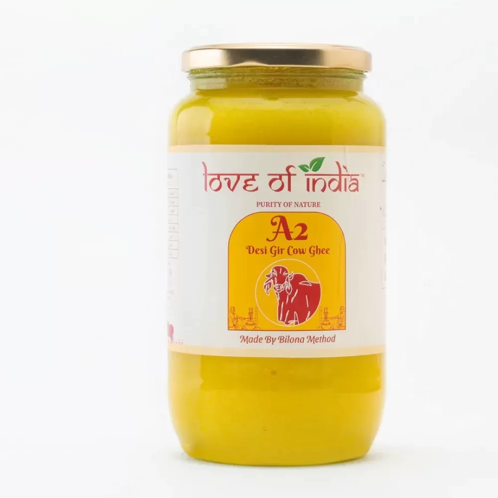 Desi Gir Cow Ghee, prepared with love for a healthy you. Love of India's Desi A2 Gir Cow Ghee is prepared using the traditional ‘Bilona’ method and is a vital source of holistic nourishment and taste. It's the Finest ghee made from A2 milk, using the Vedic process of churning yogurt and filtering as mentioned in Ayurveda.