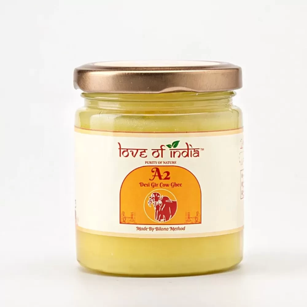 Desi Gir Cow Ghee, prepared with love for a healthy you. Love of India's Desi A2 Gir Cow Ghee is prepared using the traditional ‘Bilona’ method and is a vital source of holistic nourishment and taste. It's the Finest ghee made from A2 milk, using the Vedic process of churning yogurt and filtering as mentioned in Ayurveda.
