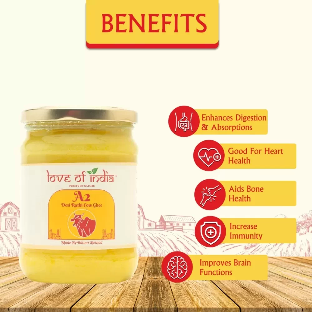 It's the Finest ghee made from A2 milk, using the Vedic process of churning yogurt and filtering as mentioned in Ayurveda. Being 100% natural, Love of India’s Desi Rathi Cow A2 ghee is perfect for everyday cooking.