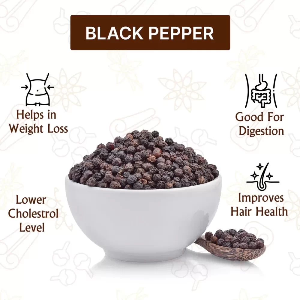 Black pepper, known as the King of Spices, gives your recipes an extra zing. It goes great with veg & non-veg recipes, in salads, soups, curries, etc. It is widely used in European, Italian, Mexican, and other international cuisines. Traditional Indian recipes use a generous amount of crushed black pepper to spice up their dishes. You can also use it to spice up eggs, avocados, fruits, and dipping sauces.