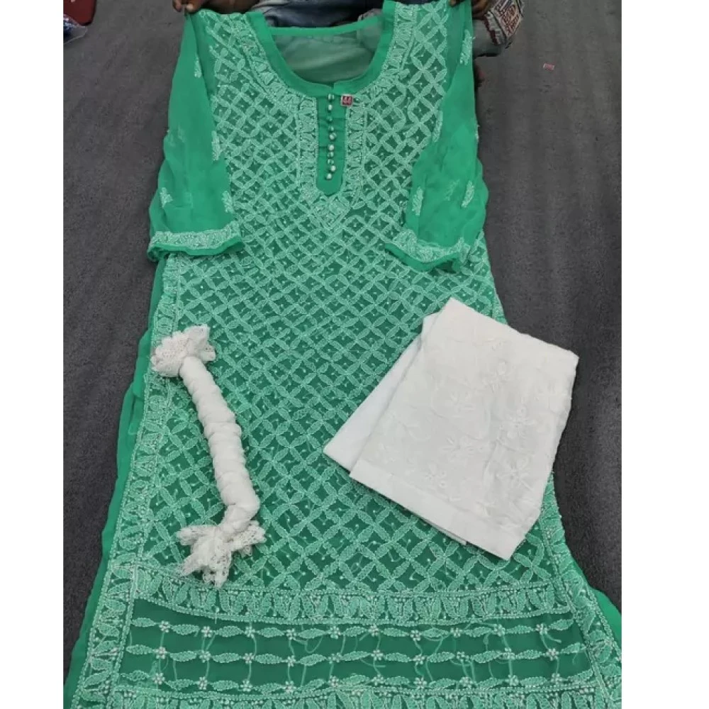 Crafted from premium-quality georgette fabric, the kurta exudes sophistication and luxury. Georgette fabric drapes beautifully, lending an ethereal charm to the outfit. The three-quarter sleeves add a touch of modesty while allowing for ease of movement, ensuring comfort throughout the day.
