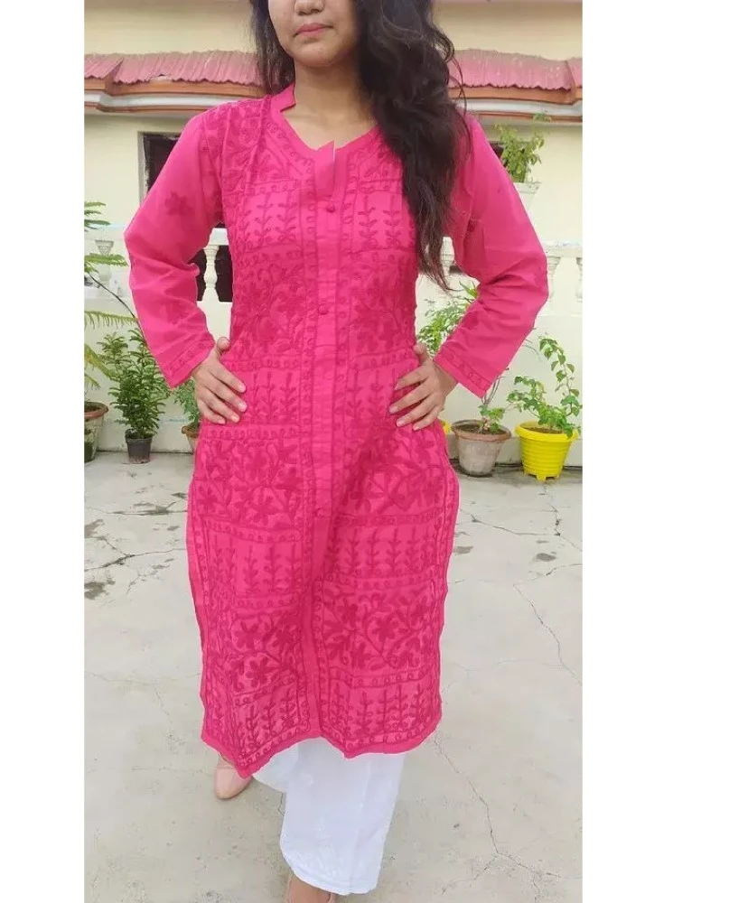 Crafted from high-quality cotton fabric, both the kurta and palazzos ensure a breathable and comfortable wearing experience. The kurta features intricate Chikankari embroidery in white, adding a touch of timeless elegance to the ensemble. With its A-line silhouette and long sleeves, the kurta offers a flattering fit and graceful look.