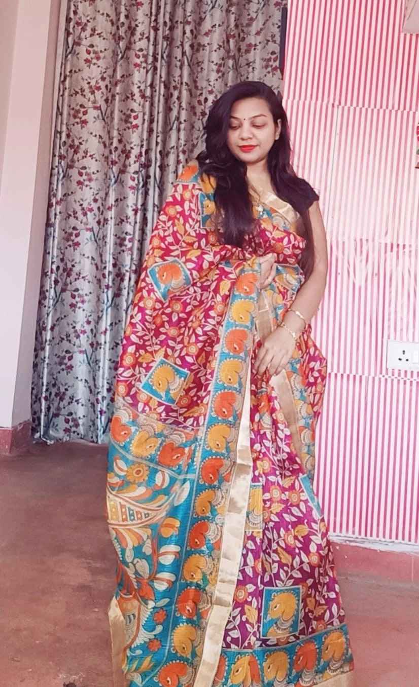 A Fancy Kalamkari Design pink saree is a perfect way to showcase your ethnic and artistic side, and make a lasting impression on everyone. It is a versatile and timeless piece of clothing, that can be paired with different accessories, such as earrings, necklaces, bangles, or rings, to create different looks. You can wear it with a simple blouse for a casual day out, or with a designer blouse for a festive or wedding occasion. You can also experiment with different ways of draping the saree, such as the Gujarati style, the Bengali style, the butterfly style, or the lehenga style, to suit your personality and mood.