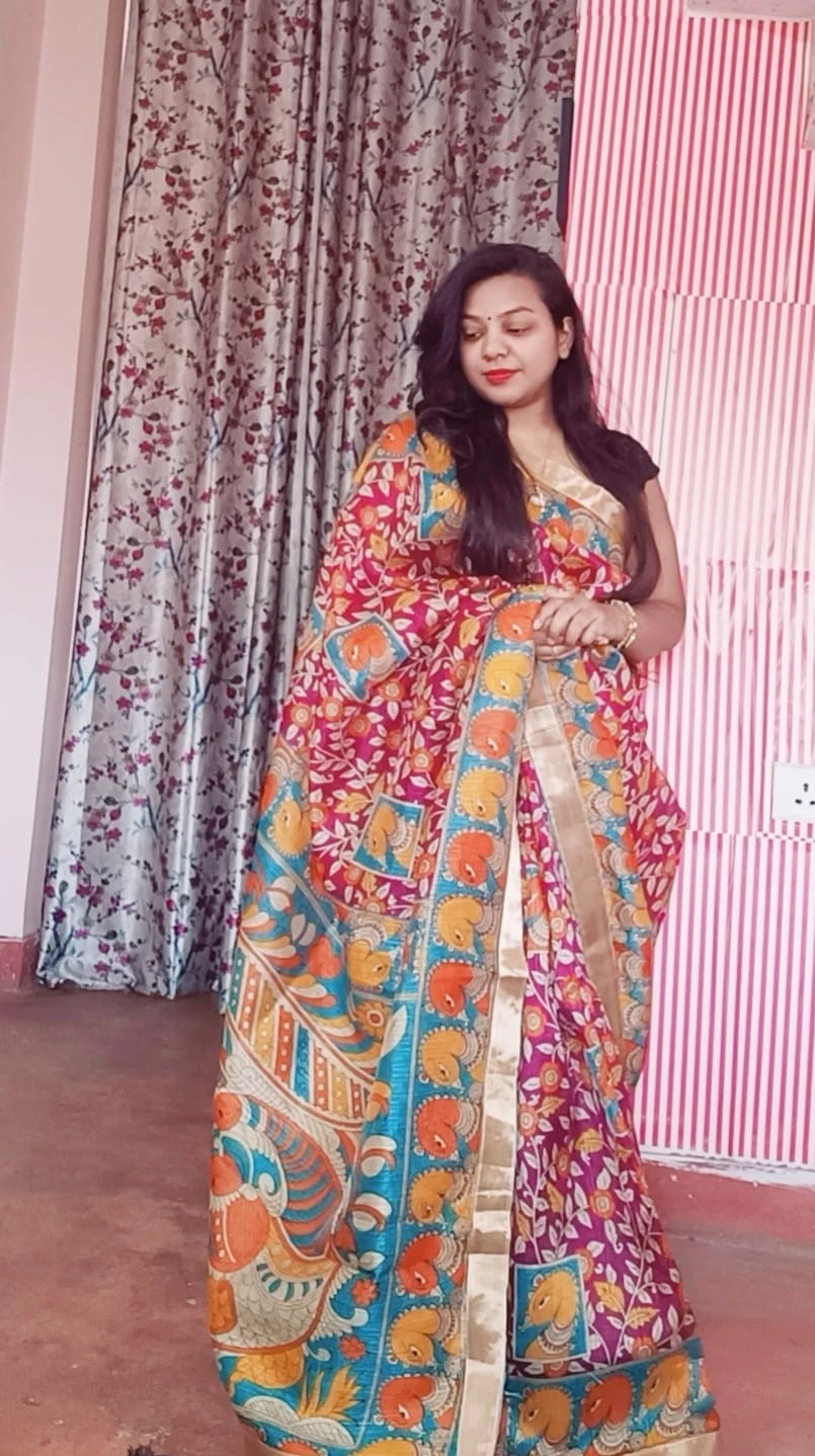 A Fancy Kalamkari Design pink saree is a beautiful and elegant choice for any occasion. Kalamkari is a traditional art of hand-painting or block-printing on fabrics, usually with natural dyes. The word Kalamkari means "pen work" in Persian, as the designs are often drawn with a bamboo pen or kalam. The motifs of Kalamkari are inspired by nature, mythology, and history, and often depict floral patterns, animals, birds, gods, and goddesses.