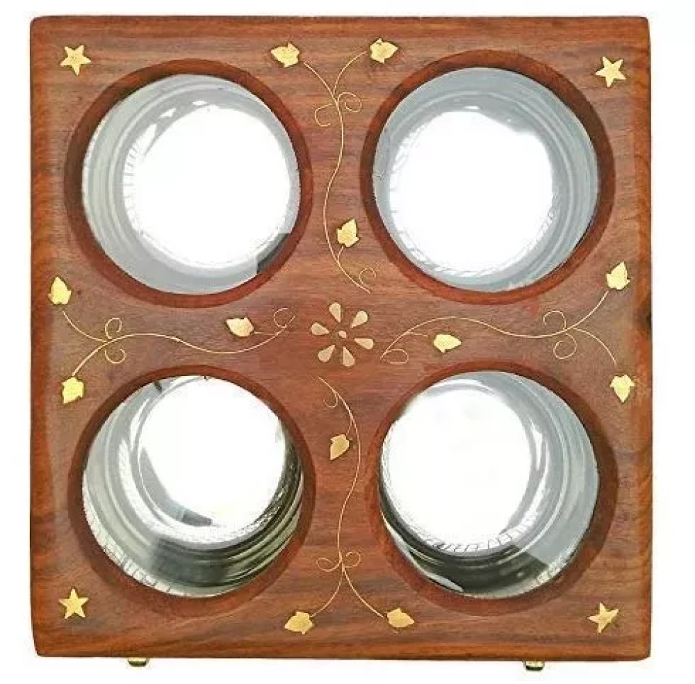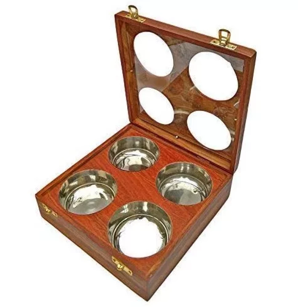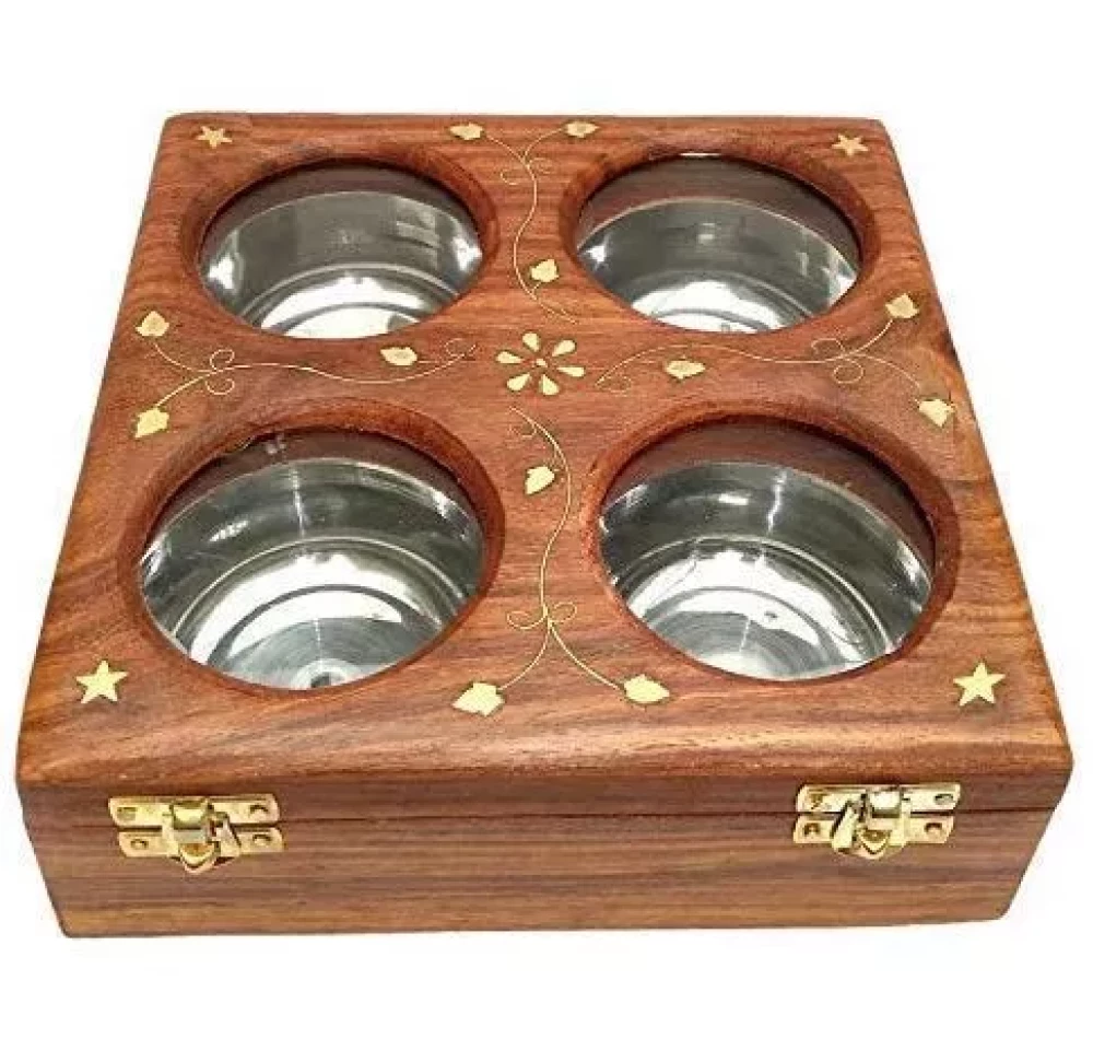 This Wooden Box Is Purely Hand-Crafted And Purposely Used For Keeping The Dry Fruits. It Contains 4-Bowls Of High Quality Stainless Steel with Brass Locks. The Artistic Work Makes It A Multi-Utility Box Which Fulfills The Serving Requirement Before The Guests. The Brown Color Gives It A Very Traditional Look, Thereby, Making It Visually Attractive