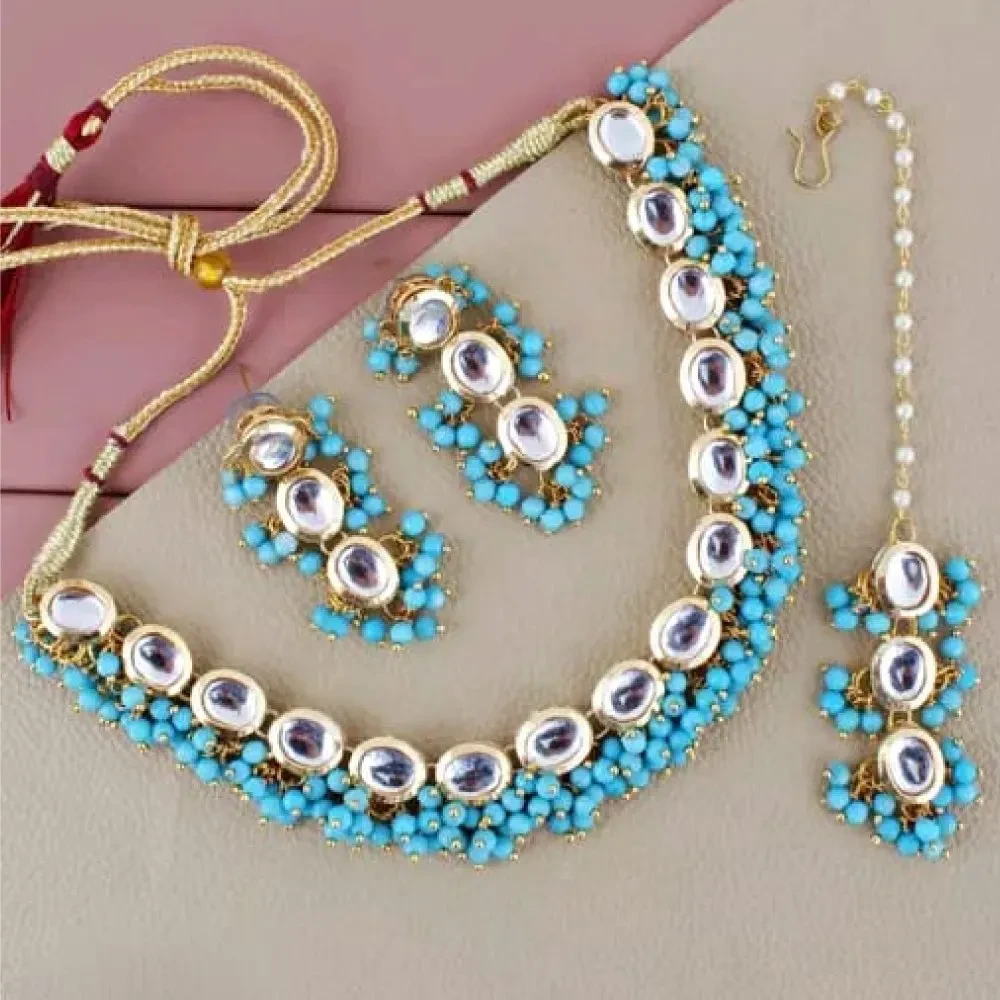 Add a splash of elegance and vibrant color to your jewelry collection with this stunning Gold Plated Firozi Color Necklace Set. This exquisite set features a beautifully designed necklace, matching earrings, and a traditional maangtika, all crafted to enhance your beauty and charm.