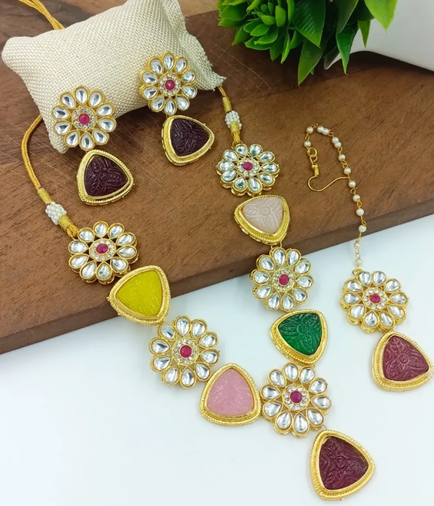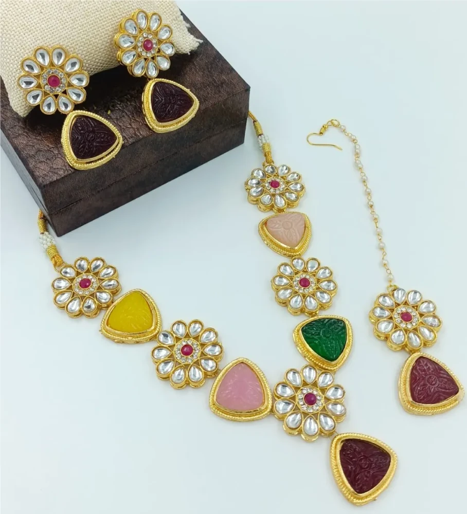 Add a vibrant splash of color and sophistication to your jewelry collection with the Triangle and Flower Look Multicolor Necklace For Women. This exquisite set combines traditional elegance with contemporary flair, featuring a stunning arrangement of multicolored stones and intricate design details.