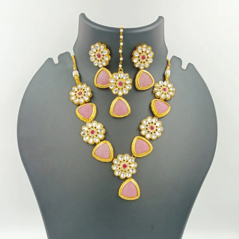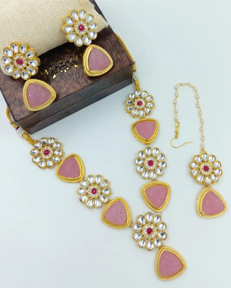 Add a touch of elegance and charm to your jewelry collection with the Triangle and Flower Look Pink Necklace For Women. This exquisite set combines geometric precision with floral grace, creating a stunning piece that enhances any outfit.