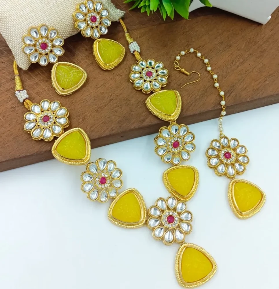 Discover the vibrant charm of the Triangle and Flower Look Yellow Necklace For Women, a stunning set designed to enhance your style with its eye-catching design and elegant details. This jewelry set features a harmonious blend of geometric shapes and floral patterns, making it a standout accessory for any special occasion.