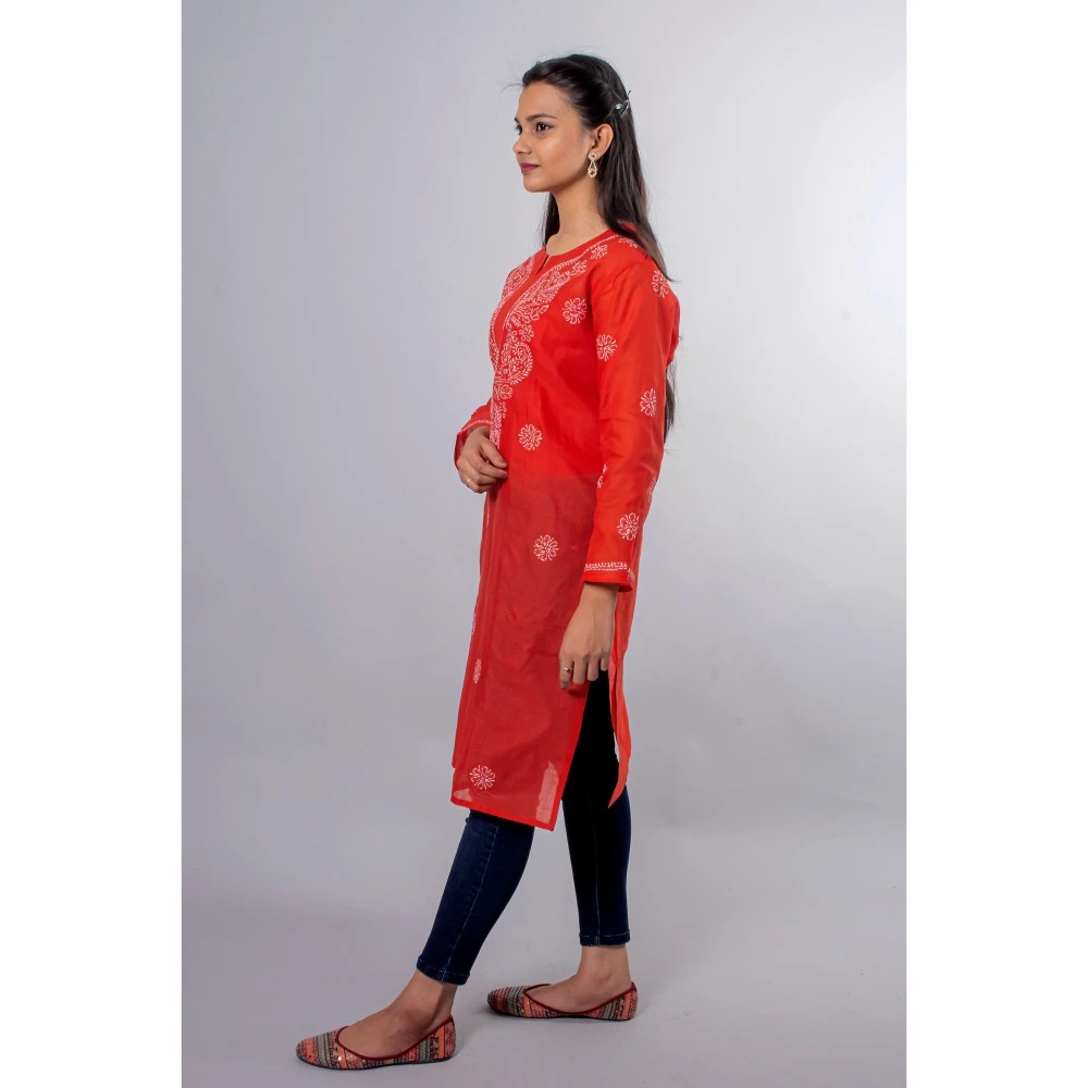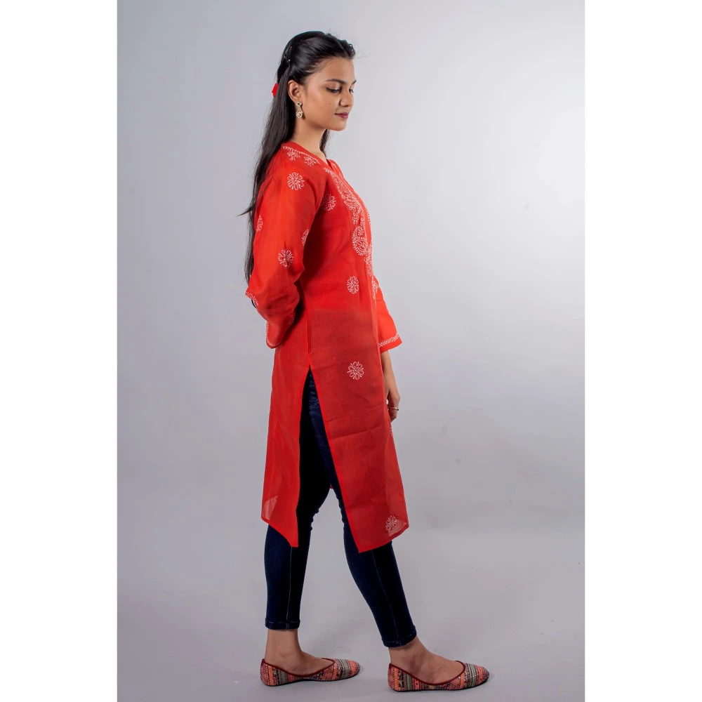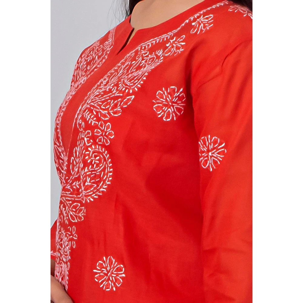 Introducing our latest Red Chikankari kurta, the Red Three-Quarter Sleeve Printed Top. Crafted from high-quality cotton, this top combines comfort and style effortlessly, making it a must-have for your wardrobe.