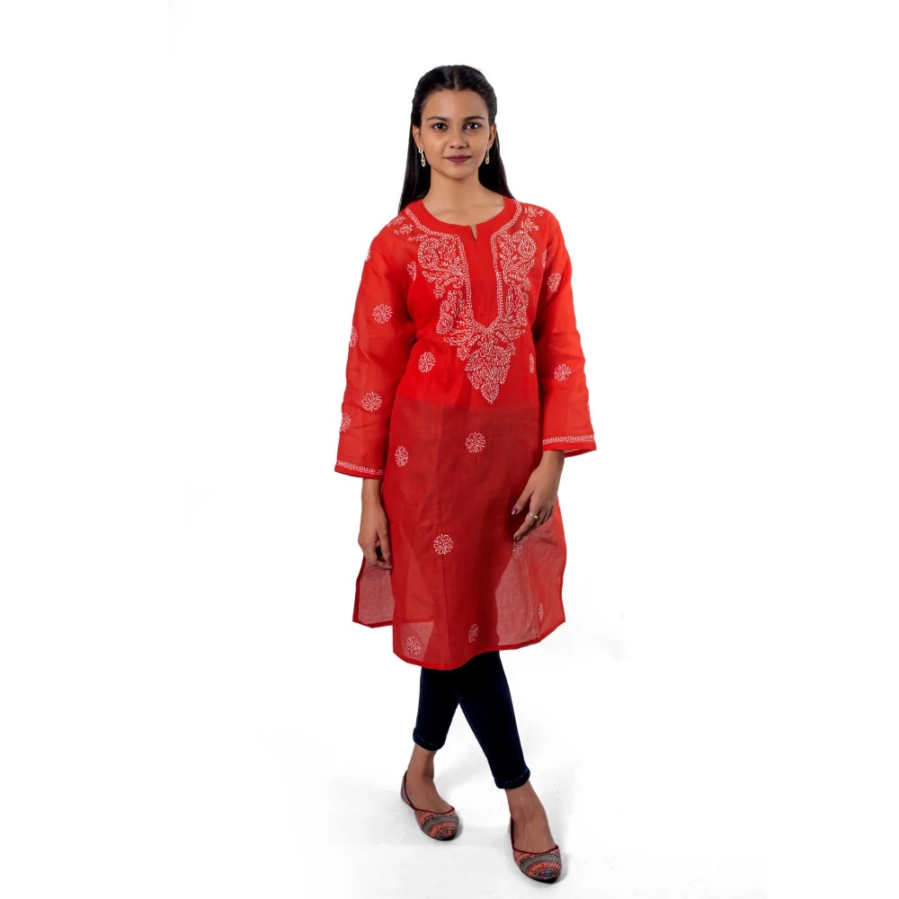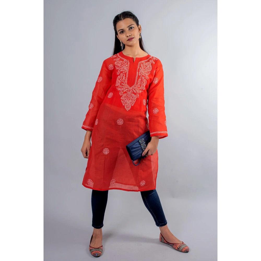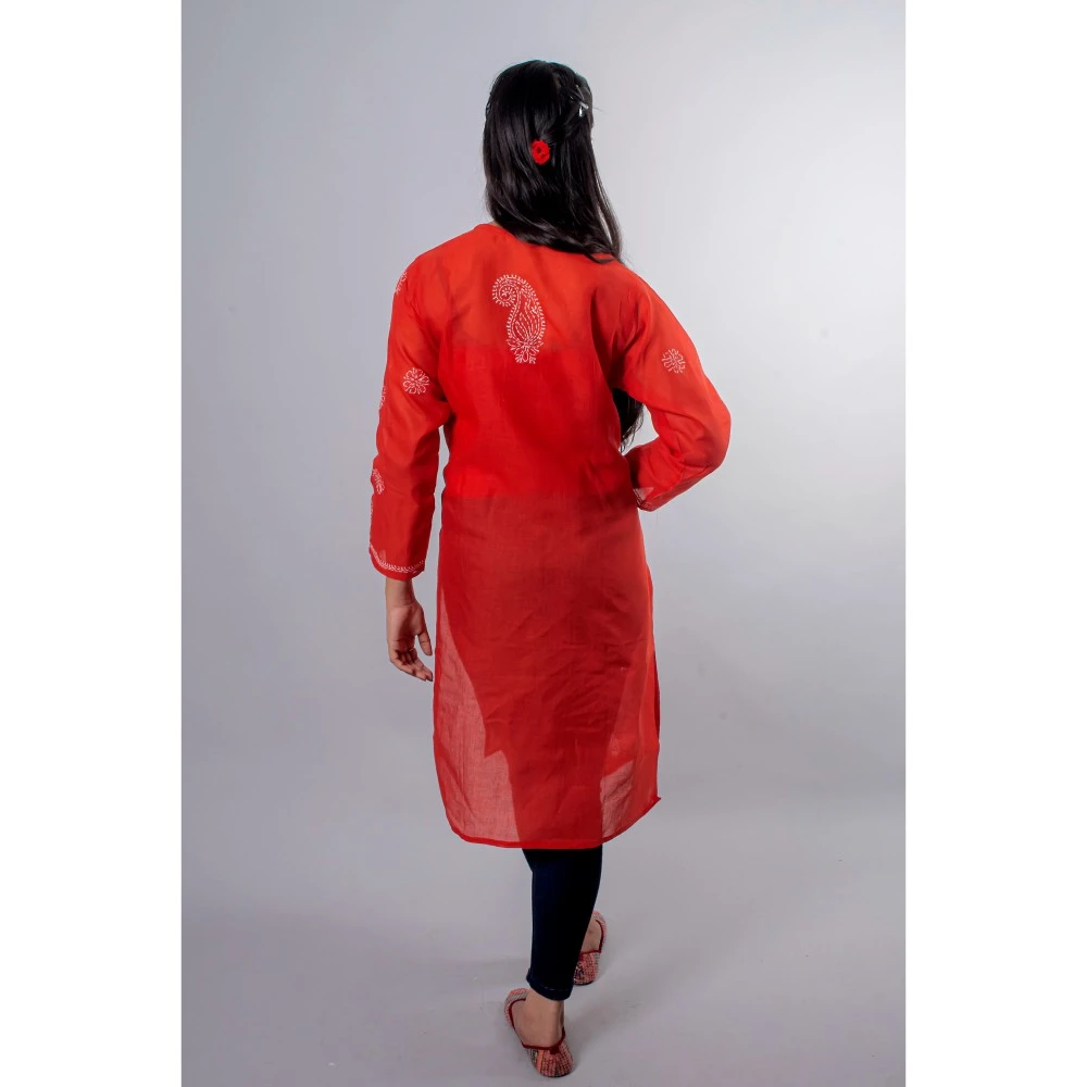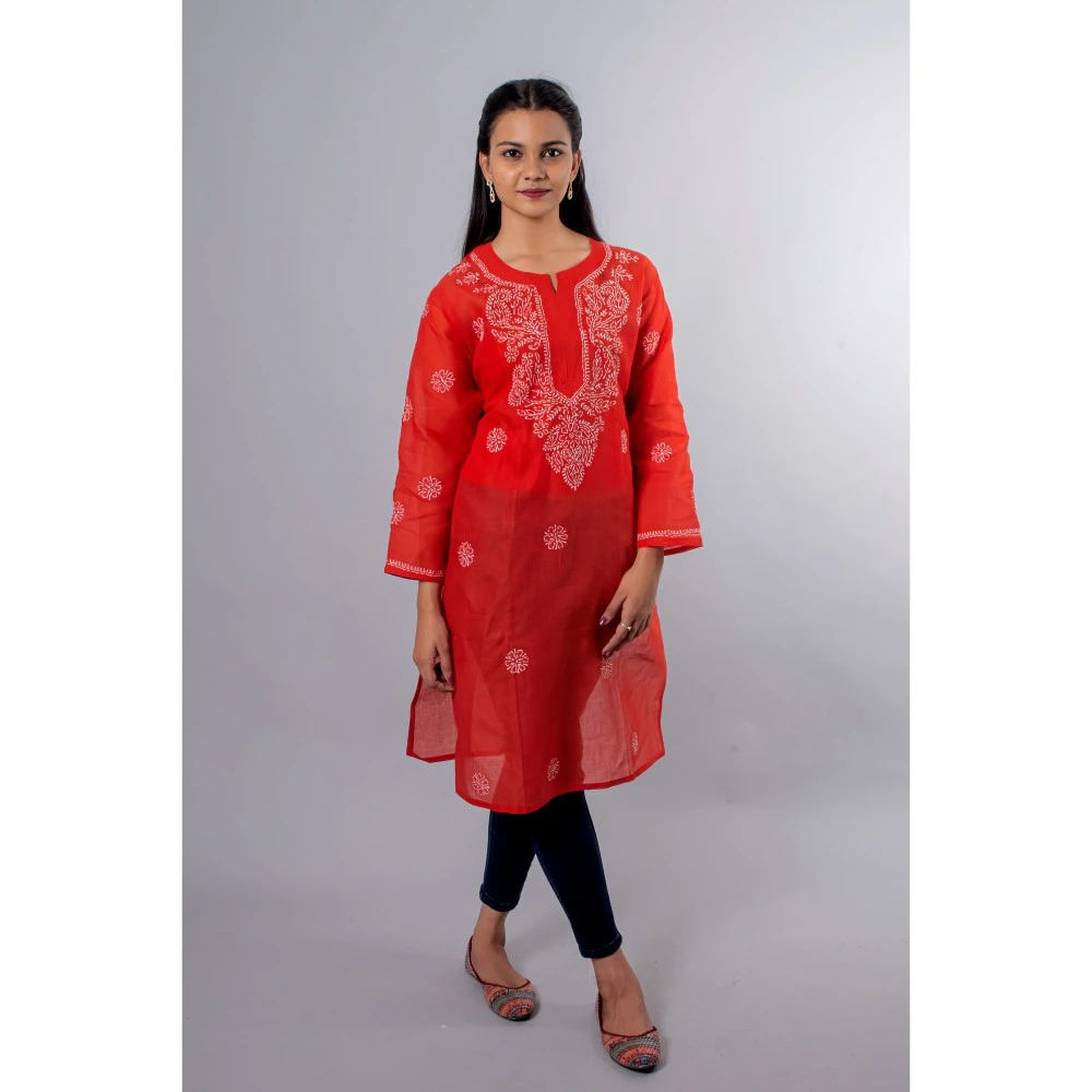 Introducing our latest Red Chikankari kurta, the Red Three-Quarter Sleeve Printed Top. Crafted from high-quality cotton, this top combines comfort and style effortlessly, making it a must-have for your wardrobe.