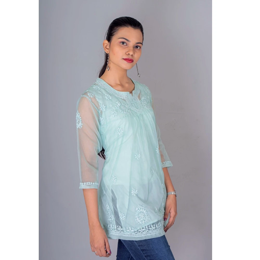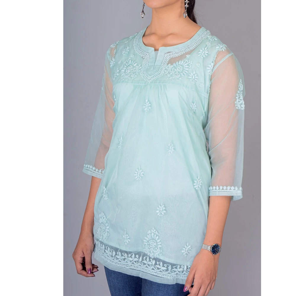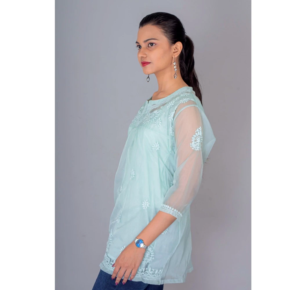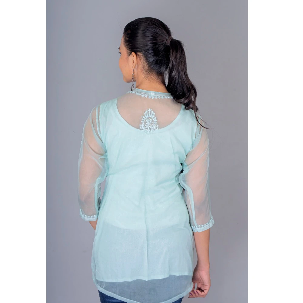 Manal Kreations Organza blue Chikankari short top