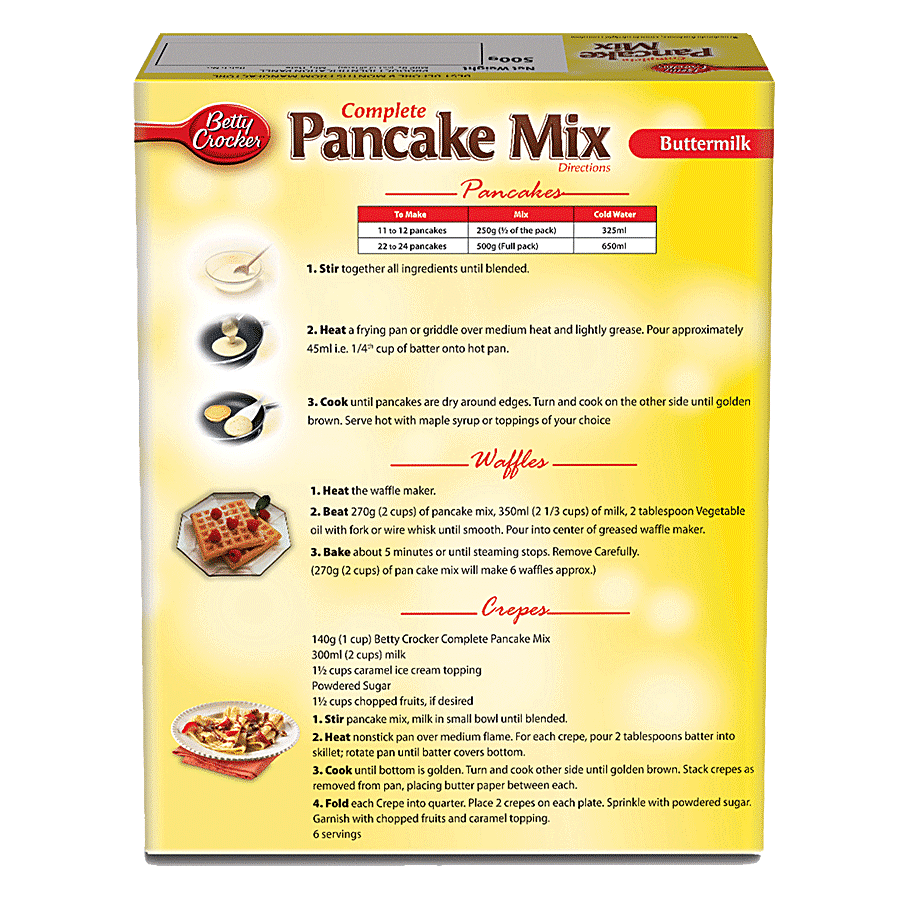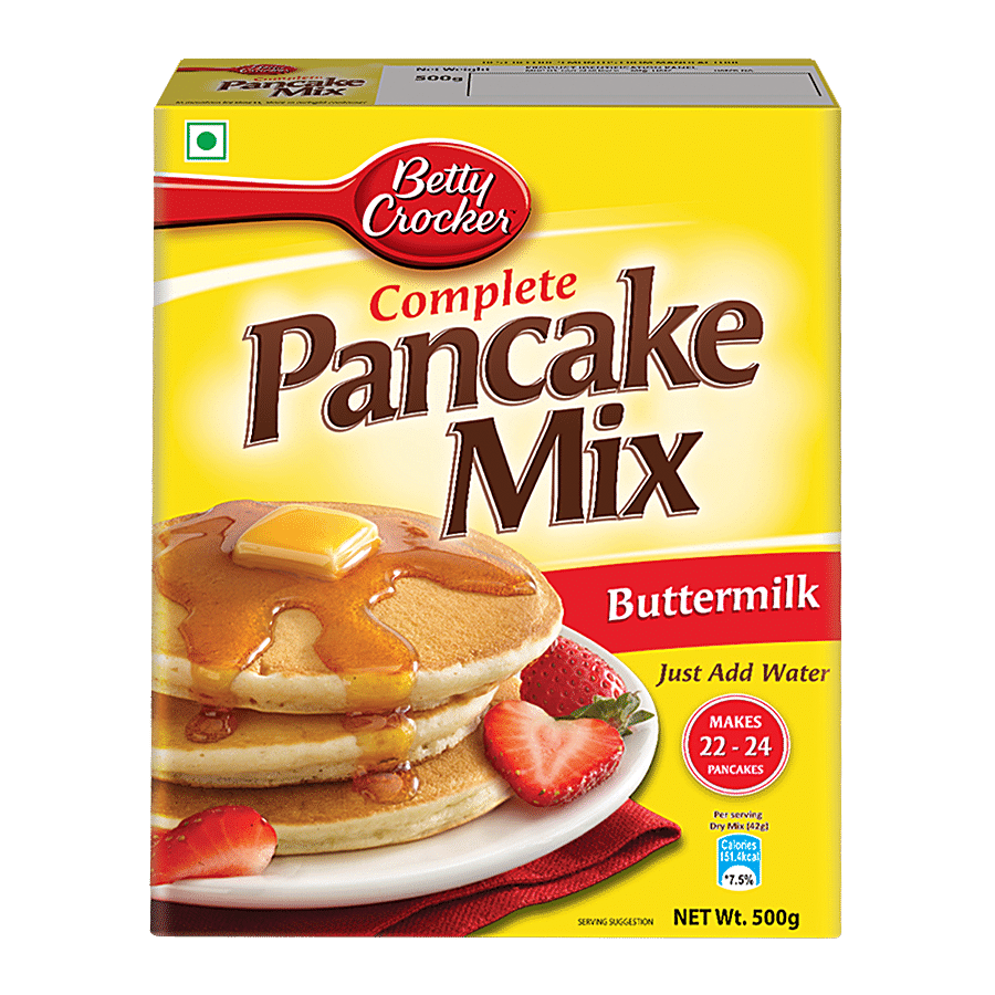 Bored of the same old breakfast and scared to spend a lot of time doing something exciting? Make your breakfast exciting with Betty Crocker pancakes! In less than 10 minutes of preparation time, you can serve fluffy pancakes! There’s room to get extra creative with a variety of toppings like maple syrup, honey, chocolate sauce, fruits, choco chips and what not! Plus, with 22-24 servings, there’s nothing better than waking up in the morning to warm pancakes! The addition of buttermilk in the batter makes them extra delicious and buttery, of course. Buttery and creamy pancakes for a filling and delicious breakfast. Just add some water to the mixture and get ready to taste some scrumptiously tasty pancakes. It takes only 2 minutes to make after you put it in the pan. 500 Kg pack that can serve up to 22-24 pancakes. It tastes best with maple syrup, honey, fruits, jam, and chocolate spread. Start your day on a sweet note with Betty Crocker Pancakes. They're easy to make and delicious to eat. Have it as a healthy breakfast, snack, lunch or as a dessert after dinner.