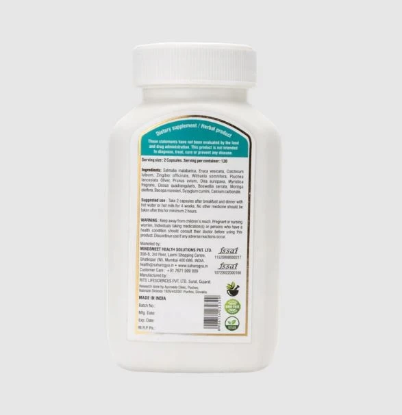 • Ingredients: Salmalia Malabarica, Eruca Vesicaria, Colchicum Luteum, Zingiber Officinale, Withania Somnifera, Pluchea Lanceolata Oliver, Prunus Avium, Olea Europaea, Myristica Fragrans, Cissus Quadrangularis, Boswellia Serrata, Moringa Oleifera, Bacopa Monnieri, Syzygium Cumini and Calcium Carbonate.