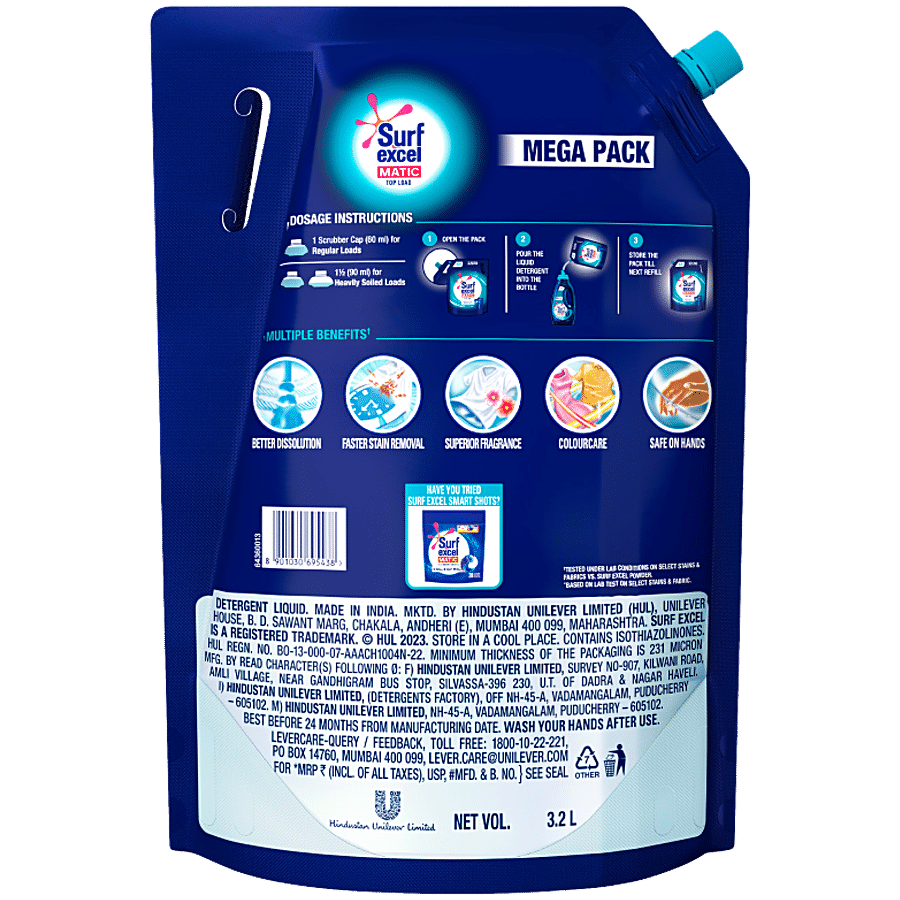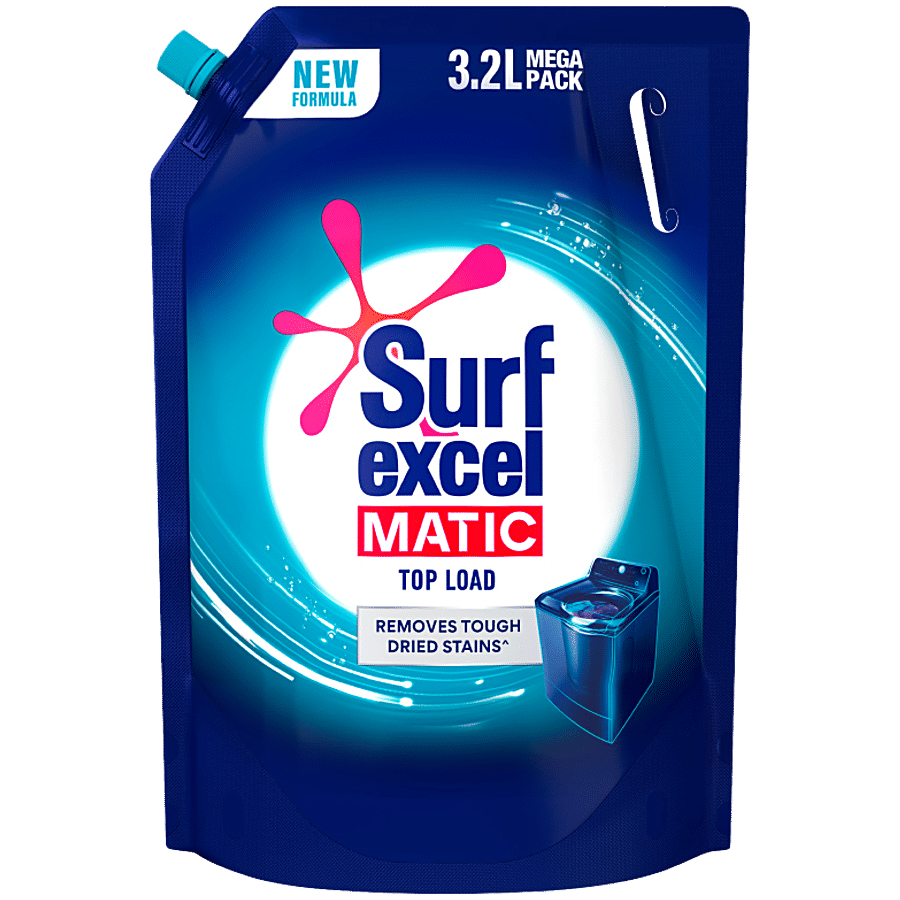 Presenting Surf Excel Matic Top Load liquid detergent - a revolutionary liquid detergent to deliver the best laundry experience in top load washing machines. Surf Excel Matic Top Load liquid detergent is specially made for your top load washing machine and gives you tough stain removal in the machine itself. Surf Excel Matic Top Load liquid detergent is effective in the high-water level environment approx. 35ltrs of your top load washing machine and dissolves completely ensuring it leaves no residue in your machine or your clothes. As a liquid detergent, its cleaning action and superior fragrance deliver a great wash experience. Surf Excel Matic Liquid with powerful cleaning technology penetrates stains faster and delivers a better clean in the washing machine compared to your handwash detergent. The multi-layer deep penetration formula works in partnership with the machine to remove tough stains in the machine itself. Try Surf Excel Matic Top Load liquid detergent for your top-load machine for a delightful laundry experience. This Surf Excel Matic Liquid detergent pouch 3.2 L pack is a refill pack and the liquid in the pouch needs to be poured into an empty 1ltr Surf Matic liquid detergent bottle. Every Stain is a sign of learning and growing, Surf Excel| Dirt is Good.