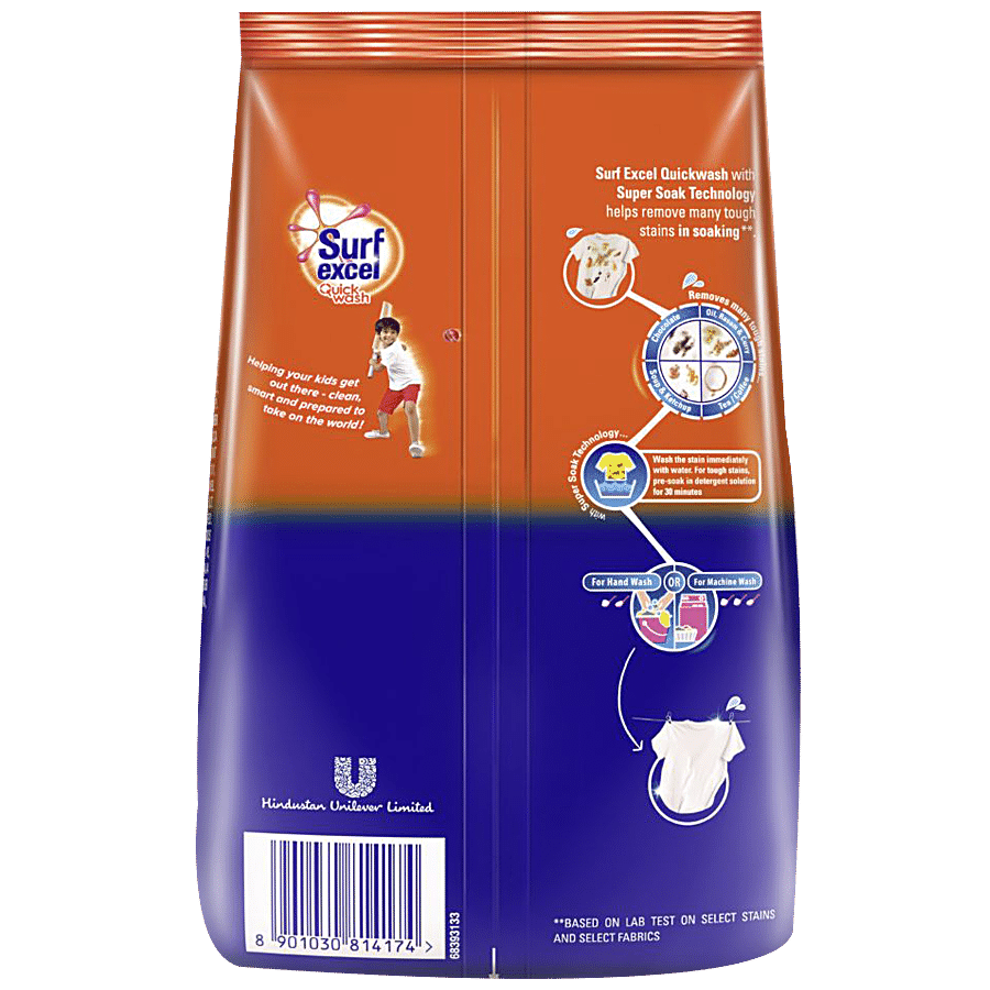 Surf Excel Quick Wash detergent powder is a one-stop solution for all your laundry needs. While learning new skills and having fun, children often come home with a variety of stains on their clothes, and more often on their very important uniforms. While you're happy that they have these new experiences, the stains leave you worried. To fight these difficult stains, you end up putting in a lot of extra effort and use additional stain removers such as bleach and lemon. It's time you switch to this detergent powder and say goodbye to long laundry routines and juggling with different stain removal products each day. It is one of the premium most detergent powders available in India and has X-Tra Clean particles that combine the power of different stain-removing products such as lemon and bleach. The superior technology of Surf Excel Quick Wash removes a variety of common tough stains like oil, ketchup, chocolate, curry stains, and tea. With X-tra cleaning particles, it makes for the perfect wash. It is available in different packs such as the 500g, 1kg, and 2kg. So go ahead and order your pack of Surf Excel Quick Wash right away and let your kids get out there clean, smart, and prepared to take on the world, and leave the stains to us. *For tough stains, pre-soak the garment in a solution of Surf Excel Quick Wash for 30 minutes