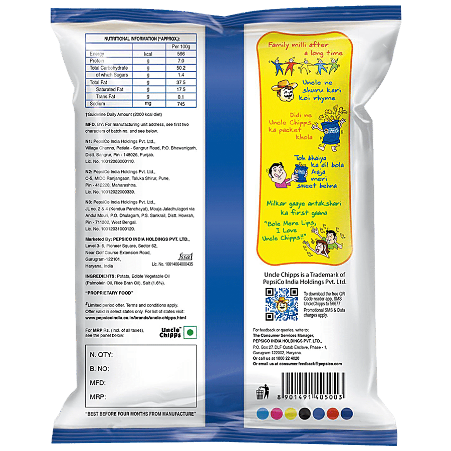 Enjoy the crunchy and crispy salted potato chips. Relive all the fun and happy memories that have been made special with a bag of everyone's favourite chips, Uncle Chips. About the brand- Uncle Chipps is a heritage brand from PepsiCo. It is warm, playful, and traditional at heart, just like the good-natured uncle everyone in the family relates to and no family gathering is complete without!