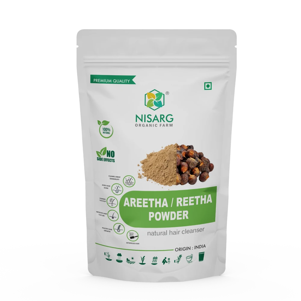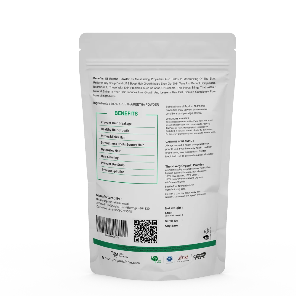 Nisarg Organic Soap Nut Powder. It is Non-GMO, 100% Pure, Hypoallergenic, odorless (fragrance-free), sustainable, gentle, and versatile Natural cleaner for hair, skin, clothes, dishes, and households.