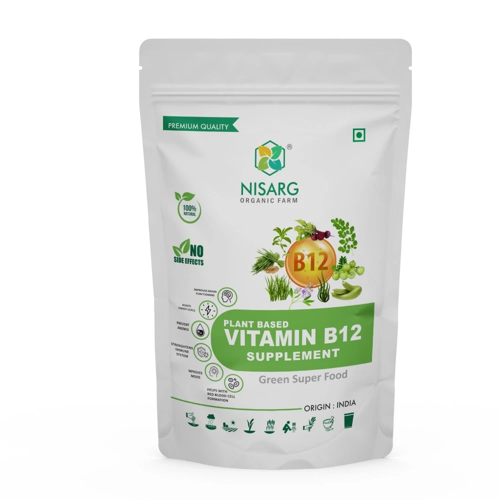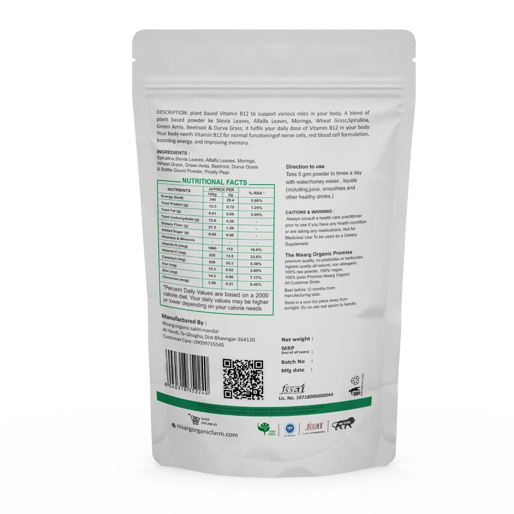 Introducing Nisarg Organic Farm’s Vitamin B12 Supplements Powder – a natural and organic blend of spirulina, stiviya, Moringa leaf, wheat grass, Amla, Beet root, Bottle Gourd powder, and Prickly pear powder. By combining these nutrient-rich ingredients, we have crafted an effective supplement powder that will support your body’s daily needs. Experience the power of nature today with our Vitamin B12 Supplements Powder – it’s the perfect way to stay healthy and energized.