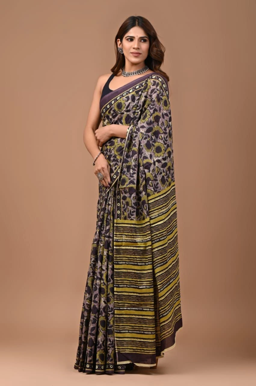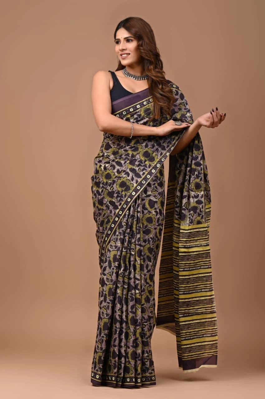 1. Fabric: Crafted from premium-quality Mulmul Cotton, this saree offers a luxurious feel and exceptional comfort. The soft and breathable fabric makes it ideal for all-day wear, ensuring you stay comfortable and stylish throughout any occasion.