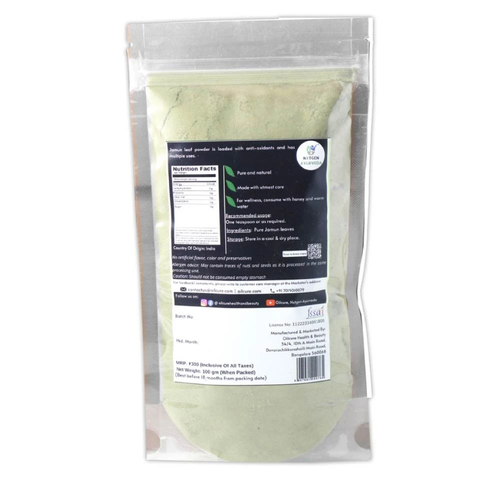 Jamun leaves powder is dried powder of Jamun tree leaves. The scientific name of this tree is Syzygium cumini, commonly known as jambolana, Java plum or black plum, is an evergreen tropical tree in the flowering plant family Myrtaceae.